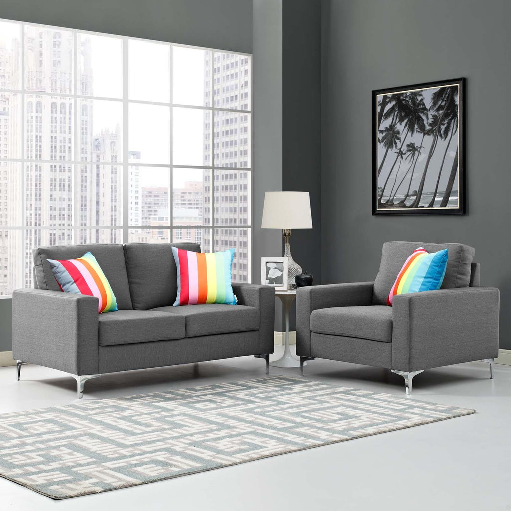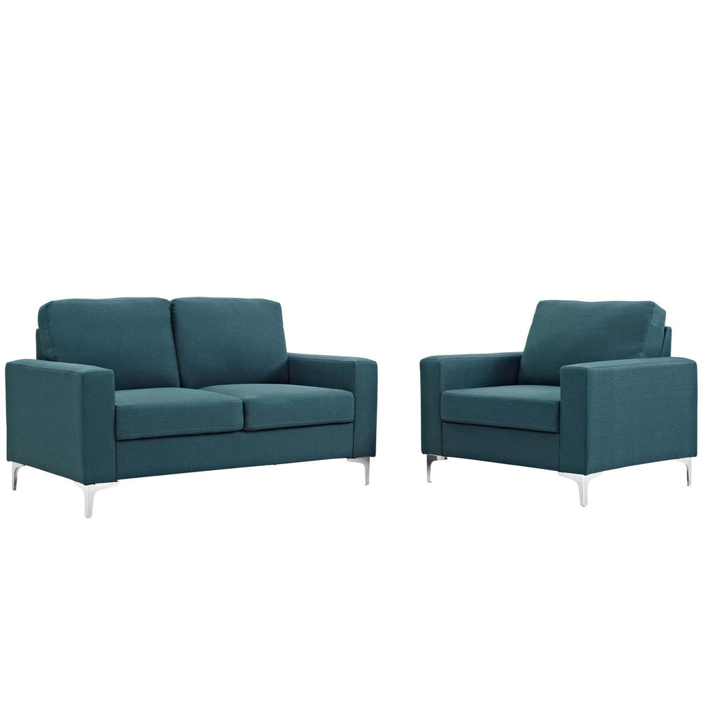 Appeal beams from every quiet line of the Allure Living Room Set. Featuring a clean design with rounded corners and a sophisticated look, Allure�s densely padded five inch thick cushions complement this expertly made soft polyester living room seating choice. Posited on powder coated steel legs with foot caps to help protect your flooring, Allure makes it easy to enjoy lounging with a novel, chatting with friends, or savoring your favorite beverage. A modern focal point of relaxation in your home, this upholstered Living Room Set is the perfect update for the contemporary home. Set Includes: One - Allure Armchair One - Allure Sofa Contemporary Modern Armchair/Sofa Upholstered In Soft Polyester 5� Thick Foam Padded Cushions Powder Coated Steel Base Non-Marking Foot Caps Assembly Required Chair Weight Capacity: 331 - 881 lbs Overall Armchair Dimensions: 34"L x 37.5"W x 34"H Seat Cushion Dimensions: 21"L x 26.5"W Seat Height: 18.5"H Backrest Height: 34"H Armrest Height: 22"H Seat Dimensions: 21"L x 45"W Seat Height: 18.5"H Backrest Height: 34"H Overall Sofa Dimensions: 34"L x 56.5"W x 33.5"H Overall Product Dimensions: 34"L x 94"W x 34"H