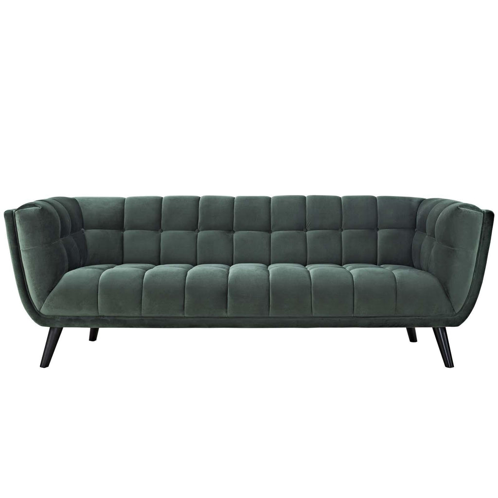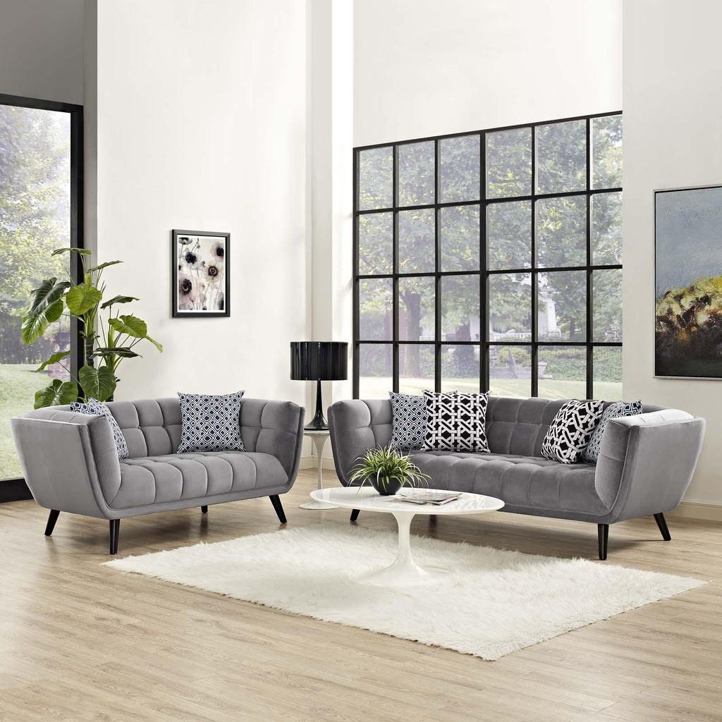 Generously update your d�cor with Bestow Performance Velvet Living Room Set. Uniquely designed with a striking broad profile, Bestow comes in soft, stain-resistant performance velvet polyester upholstery with dense foam padding and elegant button tufting. Sturdily positioned on splayed and tapered black finish wood legs with non-marking foot caps, Bestow boasts a bountiful living room seating design brimming with possibilities. With ample seat depth and overscaled frame, invite all your guests to sit comfortably in this 12" high back and arm rest collection perfect for mid-century, modern farmhouse or contemporary decors.