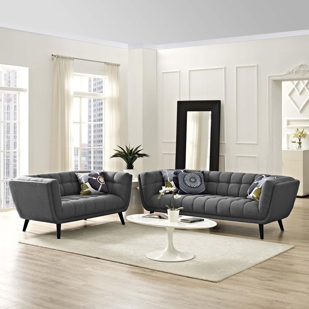 Generously update your decor with Bestow. Uniquely designed with a striking broad profile, Bestow comes finely upholstered in polyester fabric with dense foam padding and elegant button tufting. Sturdily positioned on splayed and tapered black finish wood legs with non-marking foot caps, Bestow boasts a bountiful living room seating design brimming with possibilities. With ample seat depth and overscaled frame, invite all your guests to sit comfortably in this 12" high back and arm rest collection perfect for mid-century, modern farmhouse or contemporary decors.