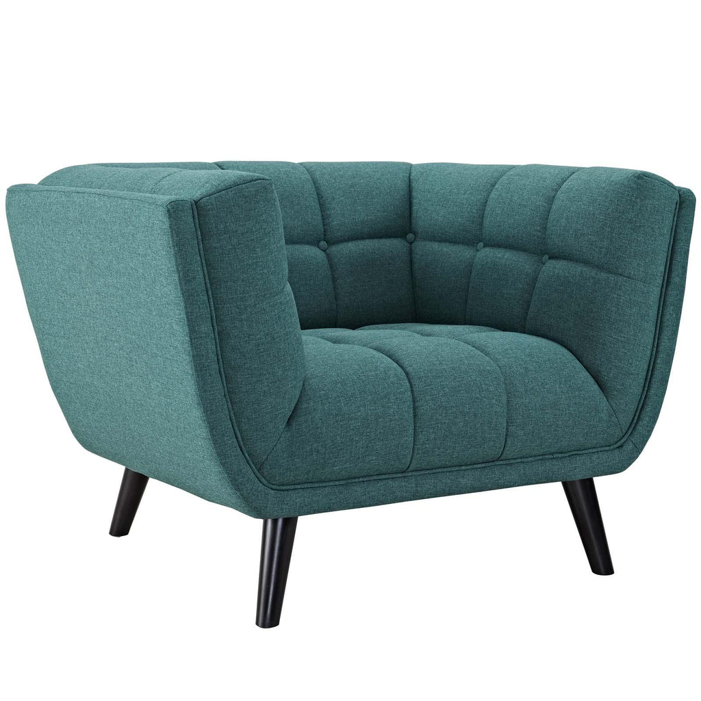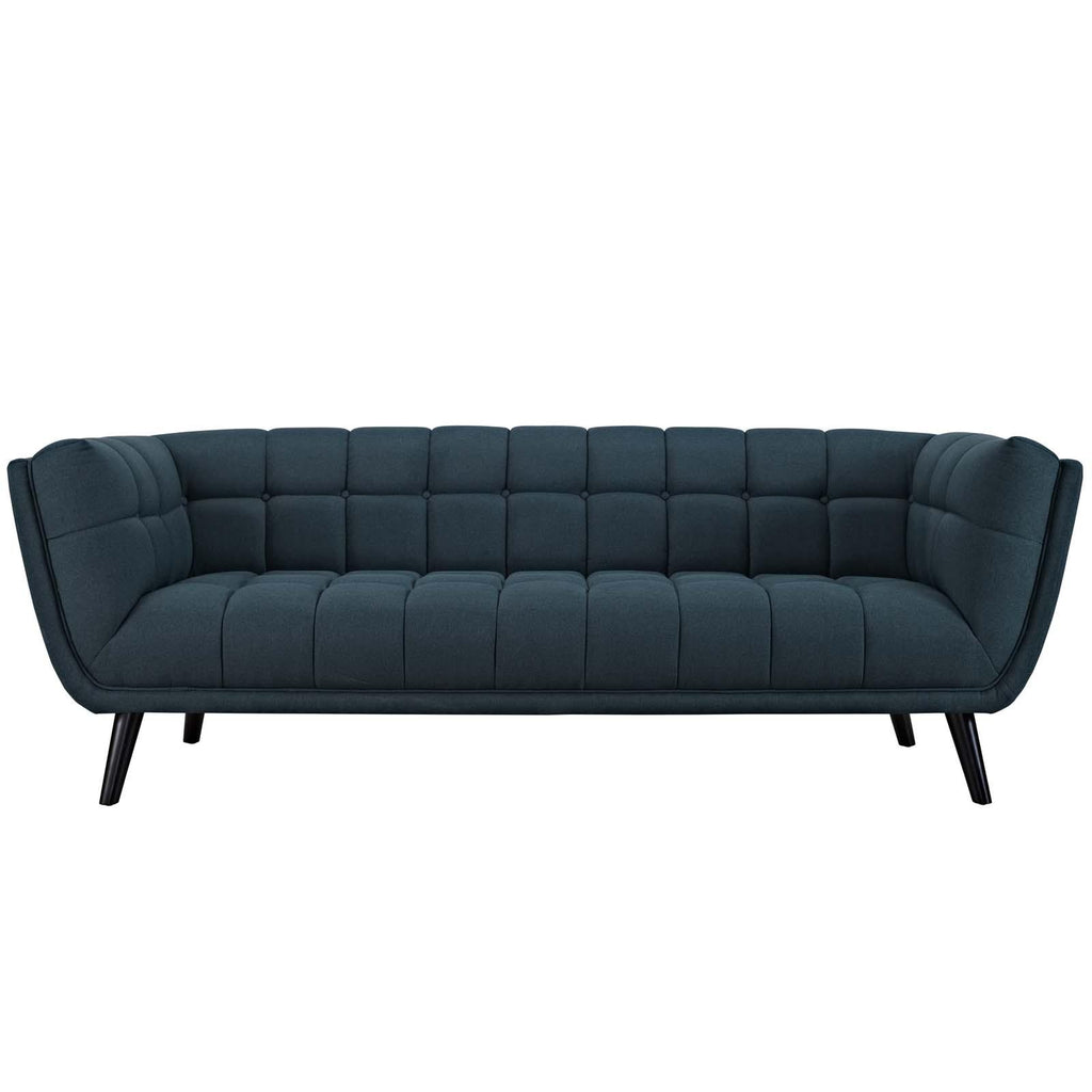 Generously update your decor with Bestow. Uniquely designed with a striking broad profile, Bestow comes finely upholstered in polyester fabric with dense foam padding and elegant button tufting. Sturdily positioned on splayed and tapered black finish wood legs with non-marking foot caps, Bestow boasts a bountiful living room seating design brimming with possibilities. With ample seat depth and overscaled frame, invite all your guests to sit comfortably in this 12" high back and arm rest collection perfect for mid-century, modern farmhouse or contemporary decors.