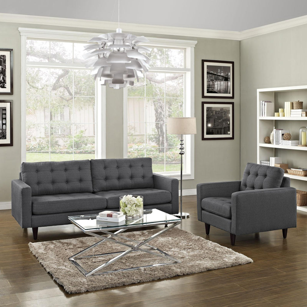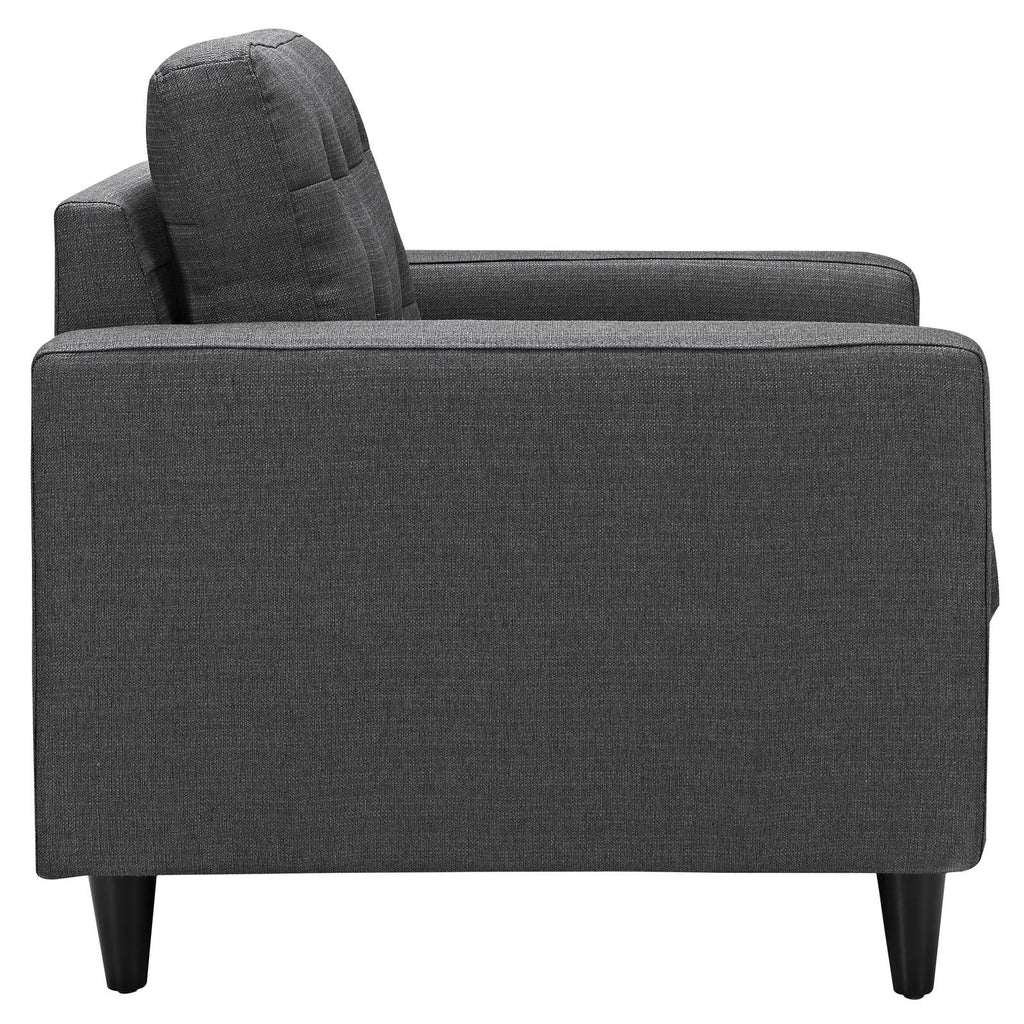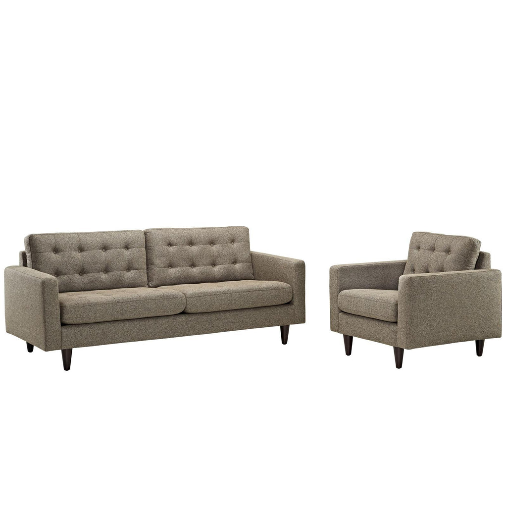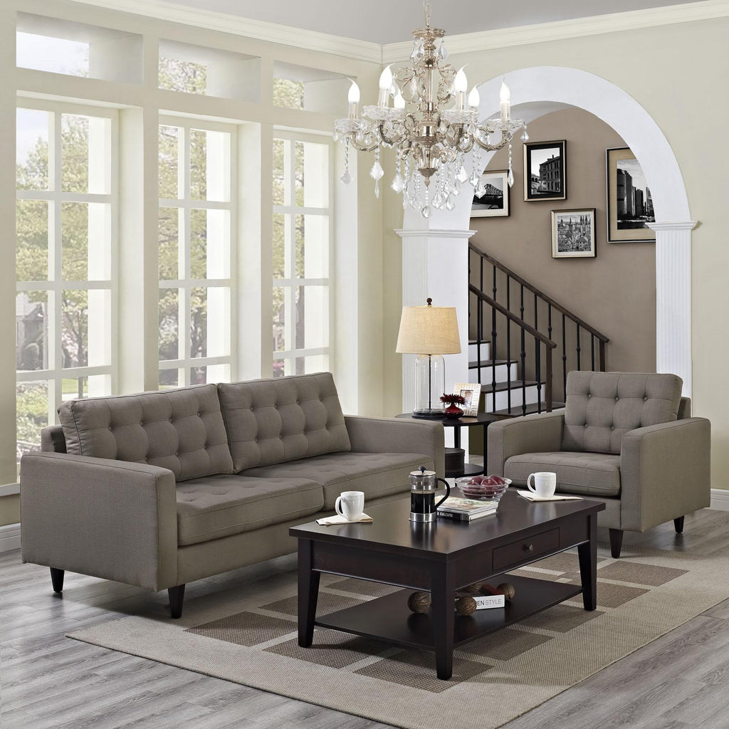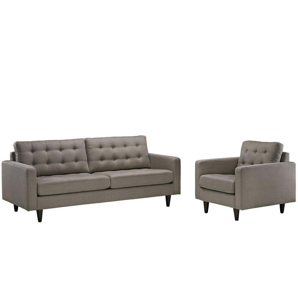 End the rule of unjust sovereignties that wage a useless war for your interiors. Empress leaves the would-be heiress of holistic furnishings in the dust with a design that rivals any competitor. Empress is heralded with deeply tufted buttons, plush cushions, and armrests that convey that perfect air of nobility. The solid wood legs come with plastic glides to prevent floor scratching, and the fine fabric upholstery leaves the recipients feeling richly rewarded. Set Includes: One - Empress Upholstered Armchair One - Empress Upholstered Sofa Modern sofa set Deeply tufted buttons Fine fabric upholstery Solid wooden legs Glides to prevent scratching Ottoman not included suspension - seat is S spring and rubber band Overall Product Dimensions: 71"L x 119"W x 35"H Armchair Dimensions: 35.5"L x 35.5"W x 35"H Sofa Dimensions: 35.5"L x 84.5"W x 35"H Sofa Seat Dimensions: 23"L x 75"W x 19"H Armchair Seat Dimensions: 23"L x 26"W x 19"H