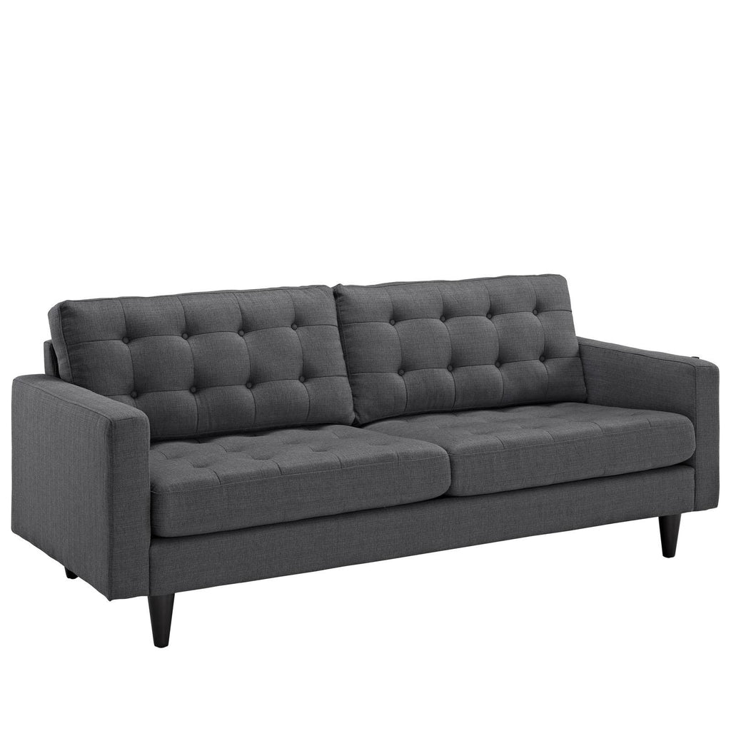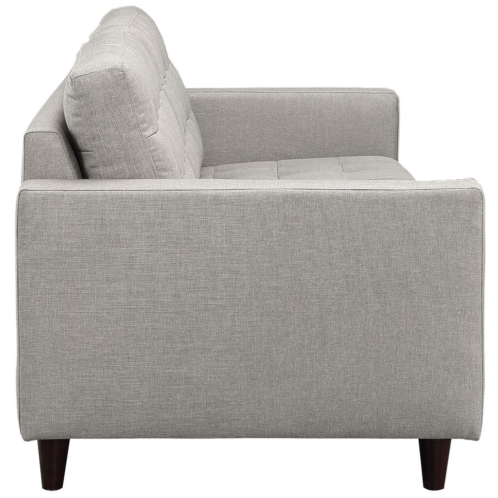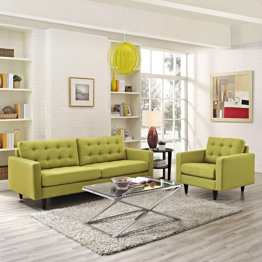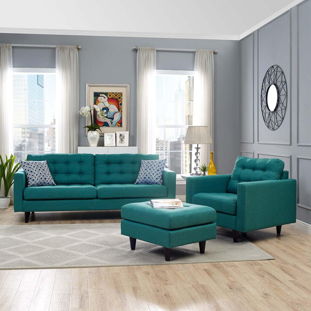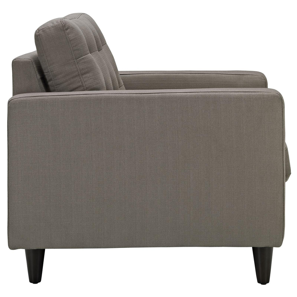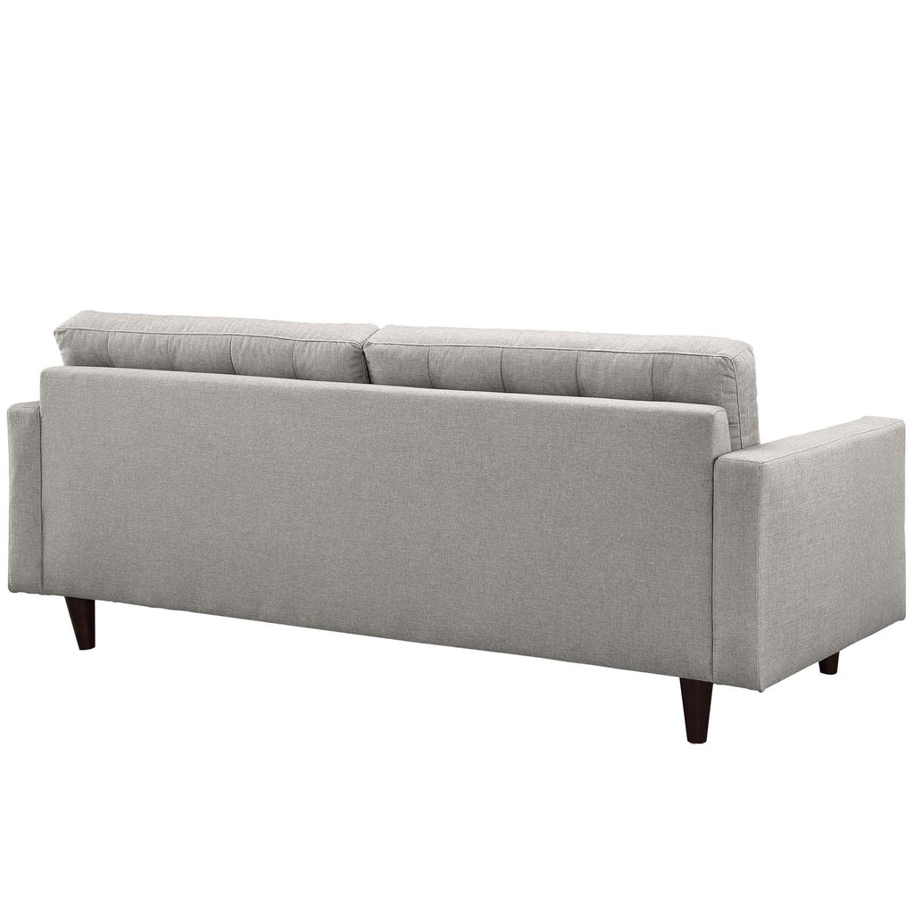 End the rule of unjust sovereignties that wage a useless war for your interiors. Empress leaves the would-be heiress of holistic furnishings in the dust with a design that rivals any competitor. Empress is heralded with deeply tufted buttons, plush cushions, and armrests that convey that perfect air of nobility. The solid wood legs come with plastic glides to prevent floor scratching, and the fine fabric upholstery leaves the recipients feeling richly rewarded. Set Includes: One - Empress Upholstered Armchair One - Empress Upholstered Sofa Modern sofa set Deeply tufted buttons Fine fabric upholstery Solid wooden legs Glides to prevent scratching Ottoman not included suspension - seat is S spring and rubber band Overall Product Dimensions: 71"L x 119"W x 35"H Armchair Dimensions: 35.5"L x 35.5"W x 35"H Sofa Dimensions: 35.5"L x 84.5"W x 35"H Sofa Seat Dimensions: 23"L x 75"W x 19"H Armchair Seat Dimensions: 23"L x 26"W x 19"H