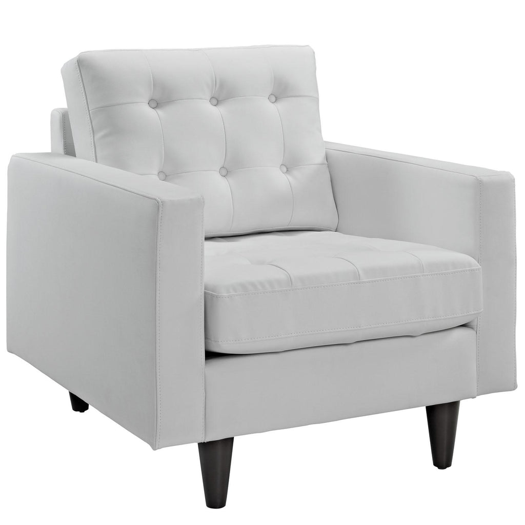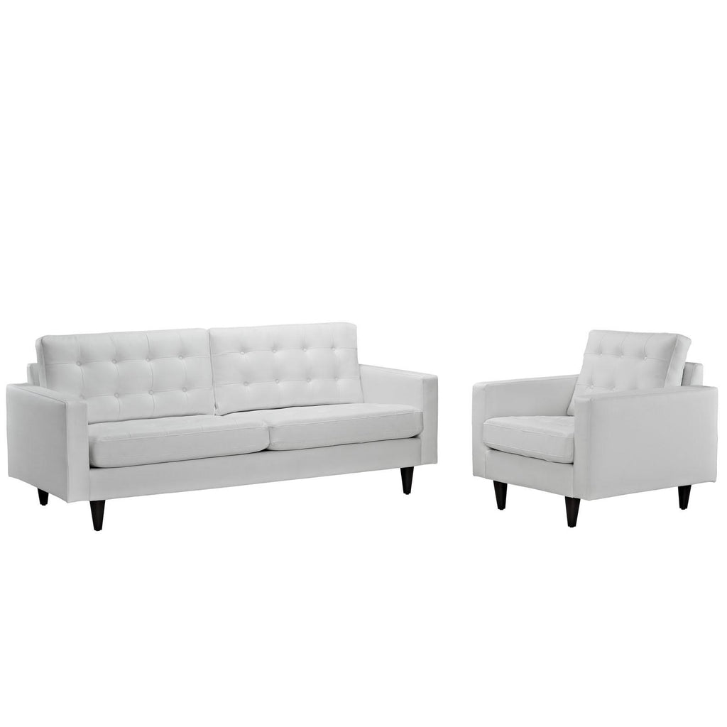 End the rule of unjust sovereignties that wage a useless war for your interiors. Empress leaves the would-be heiress of holistic furnishings in the dust with a design that rivals any competitor. Empress is heralded with deeply tufted buttons, plush cushions, and armrests that convey that perfect air of nobility. The solid wood legs come with plastic glides to prevent floor scratching, and the bonded leather upholstery leaves the recipients feeling richly rewarded. Set Includes: One - Empress Leather Armchair One - Empress Leather Sofa Modern Sofa Set Deeply tufted buttons Bonded leather Solid wooden legs Glides to prevent scratching suspension - seat is S spring and rubber band Overall Product Dimensions: 71"L x 120"W x 34.5"H Armchair Dimensions: 35.5"L x 35.5"W x 34.5"H Sofa Dimensions: 35.5"L x 84.5"W x 34.5"H Seat Dimensions: 23"L x 19"H Backrest Height: 18.5"H