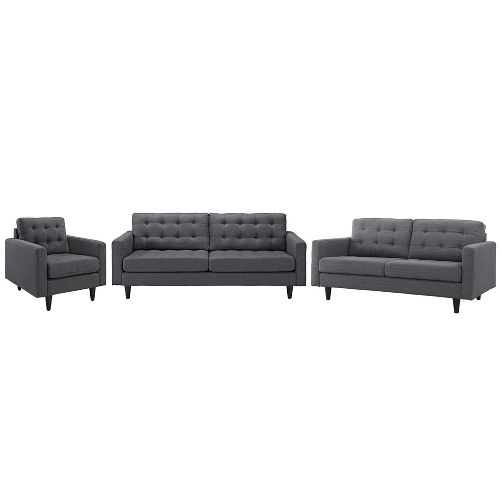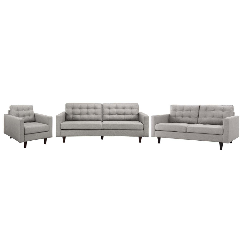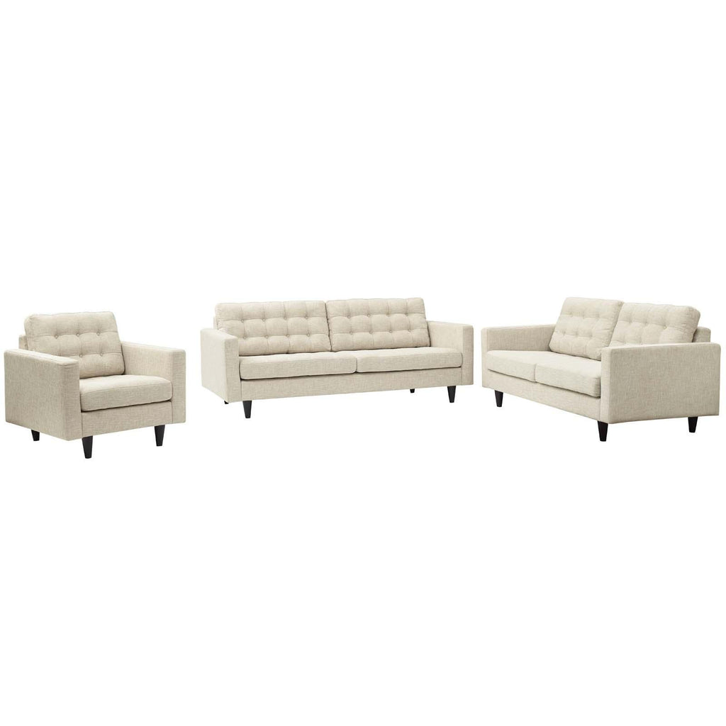End the rule of unjust sovereignties that wage a useless war for your interiors. Empress Button Tufted Upholstered Fabric Sectional Sofa Set leaves the would-be heiress of holistic furnishings in the dust with a design that rivals any competitor. Empress is a 3 piece loveseat and armchair set heralded with deeply tufted buttons, plush cushions, and armrests that convey that perfect air of nobility. The solid wood legs come with plastic glides to prevent floor scratching, and support the solidly constructed wood frame of this sectional sofa set. Dense foam padding create a luxe seating experience while the durable and stain-resistant fine fabric upholstery leaves the recipients feeling richly rewarded.