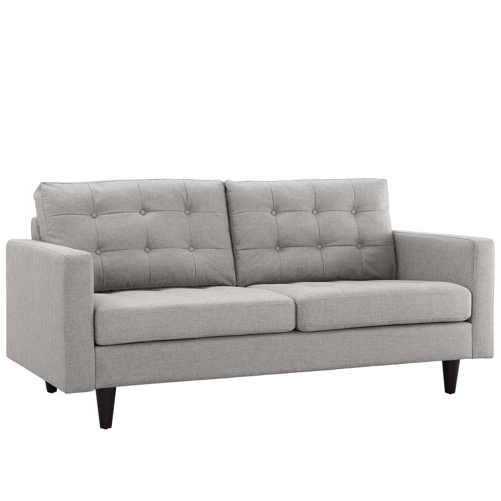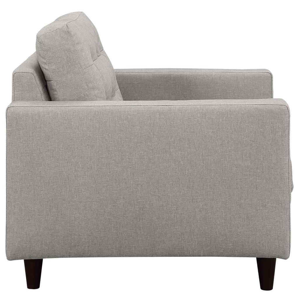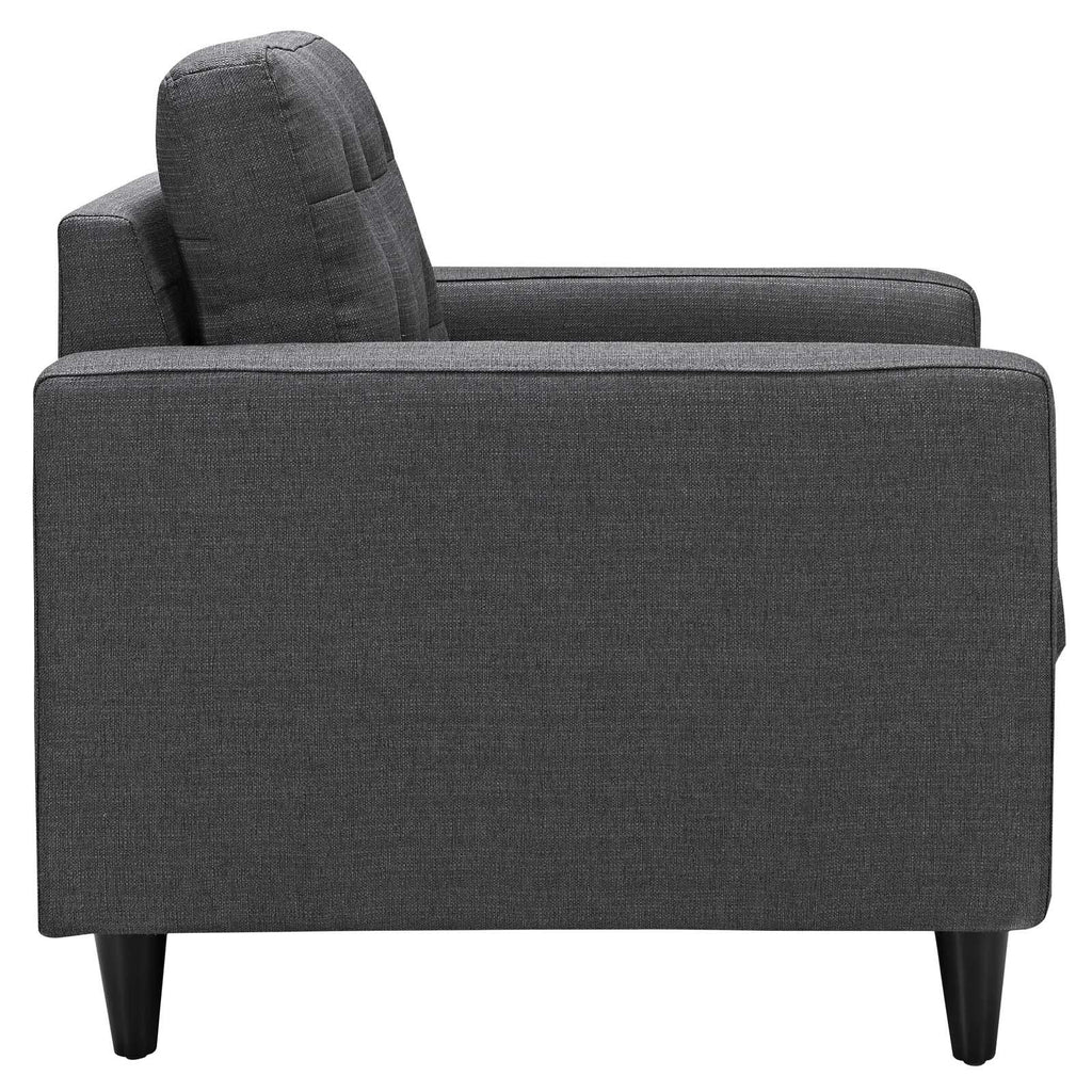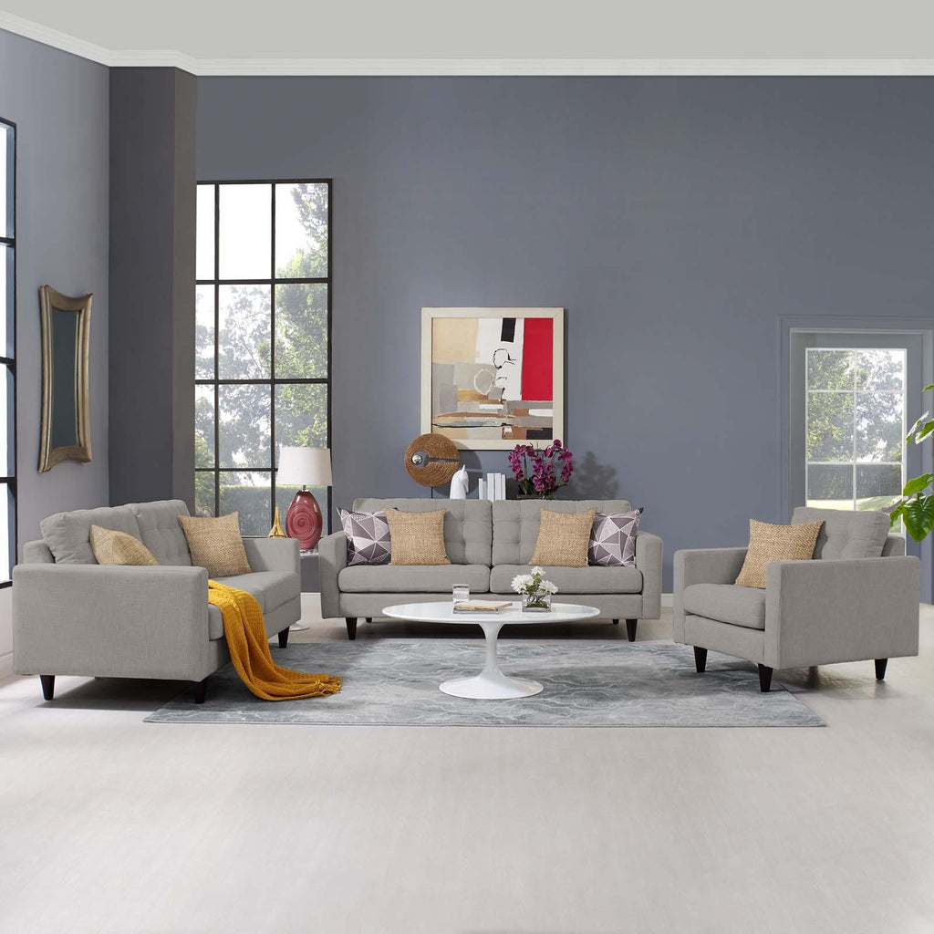 End the rule of unjust sovereignties that wage a useless war for your interiors. Empress Button Tufted Upholstered Fabric Sectional Sofa Set leaves the would-be heiress of holistic furnishings in the dust with a design that rivals any competitor. Empress is a 3 piece loveseat and armchair set heralded with deeply tufted buttons, plush cushions, and armrests that convey that perfect air of nobility. The solid wood legs come with plastic glides to prevent floor scratching, and support the solidly constructed wood frame of this sectional sofa set. Dense foam padding create a luxe seating experience while the durable and stain-resistant fine fabric upholstery leaves the recipients feeling richly rewarded.