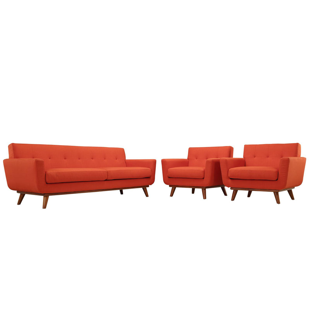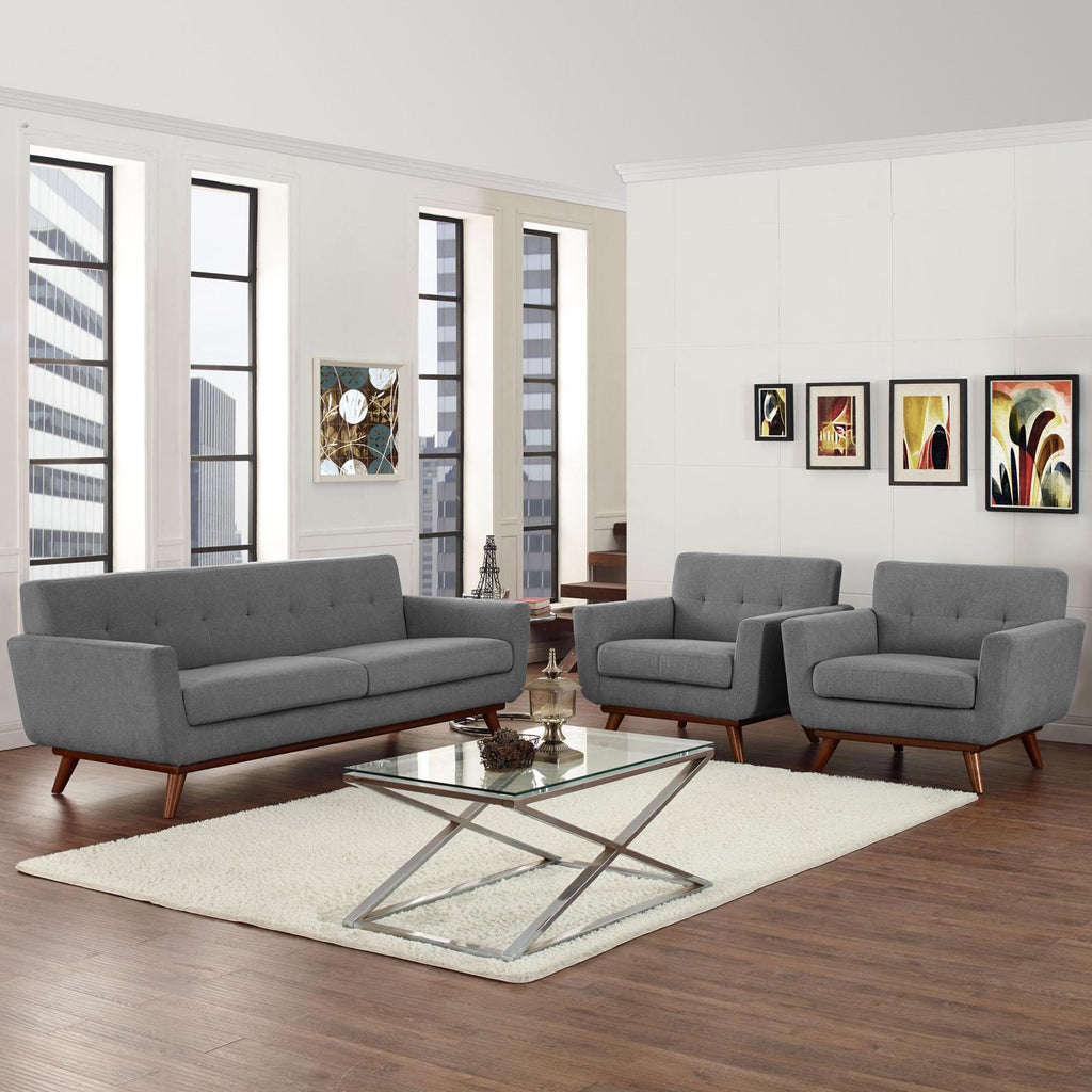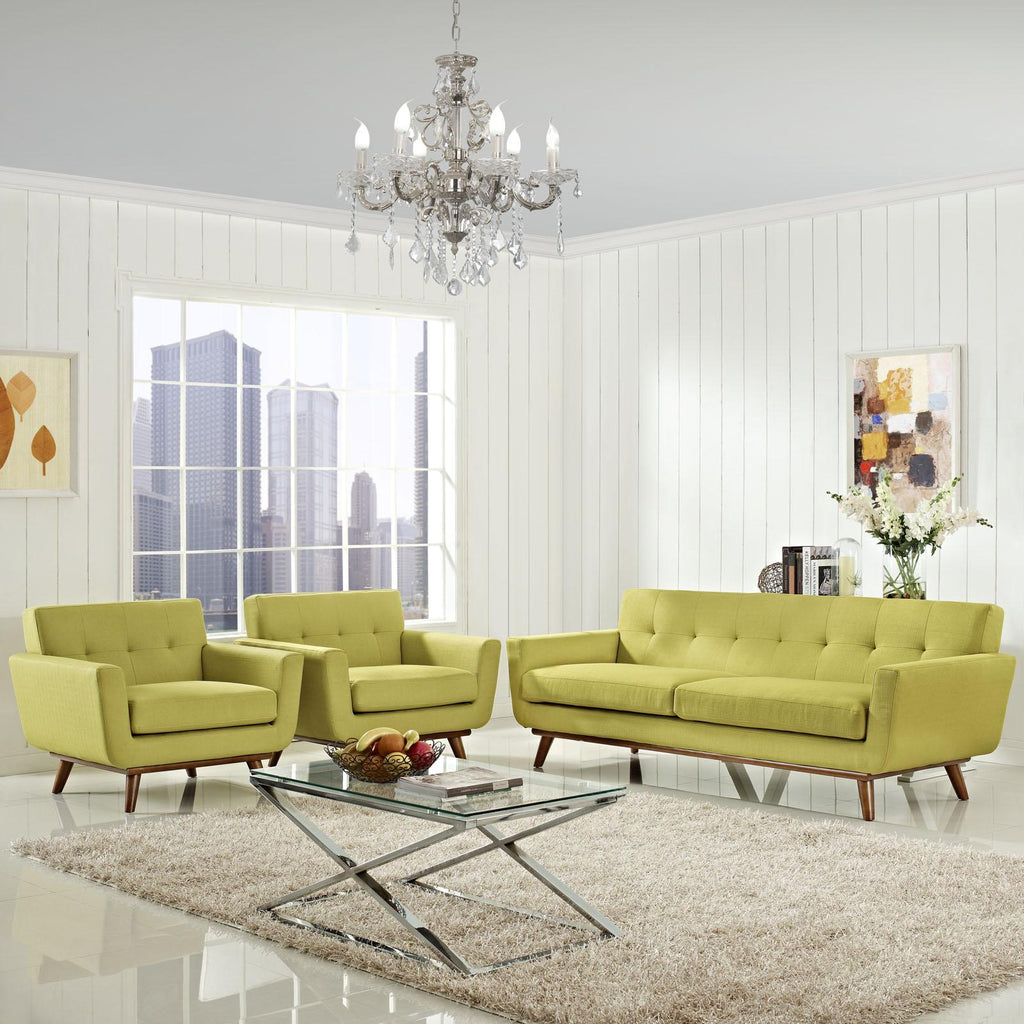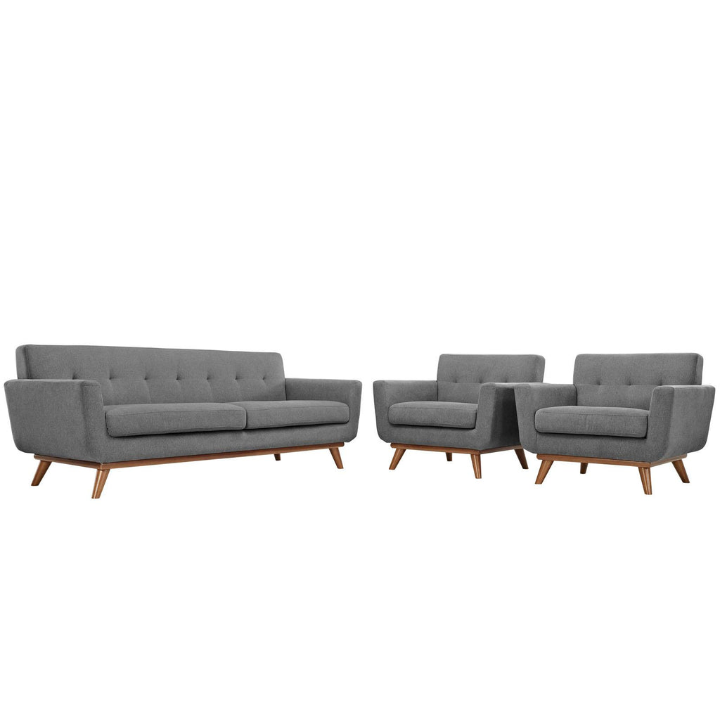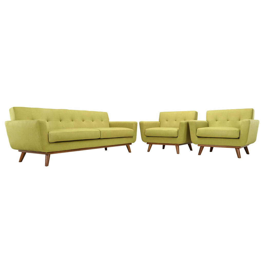 Gently sloping curves and large dual cushions create a favorite lounging spot. Whether plopping down after a long day at work, settling in with coffee and brunch, or entering a spirited discussion with friends, the Engage sofa is a welcome presence in your home. Seven tufted buttons create eye-catching appeal, adding depth that brings your sitting d�cor to center stage. Four cherry color rubberwood legs and frame supply a solid base to the comfortable upholstered material.