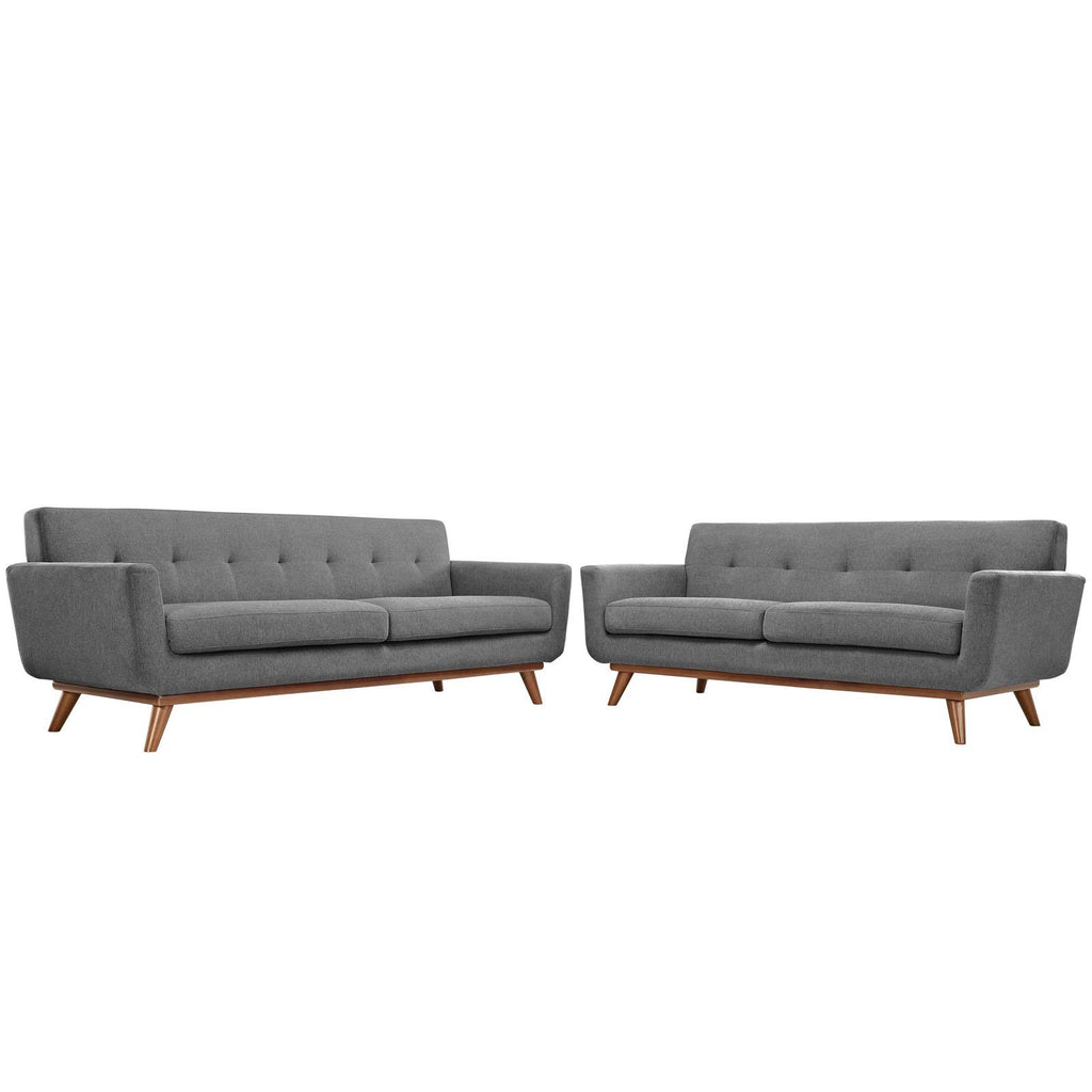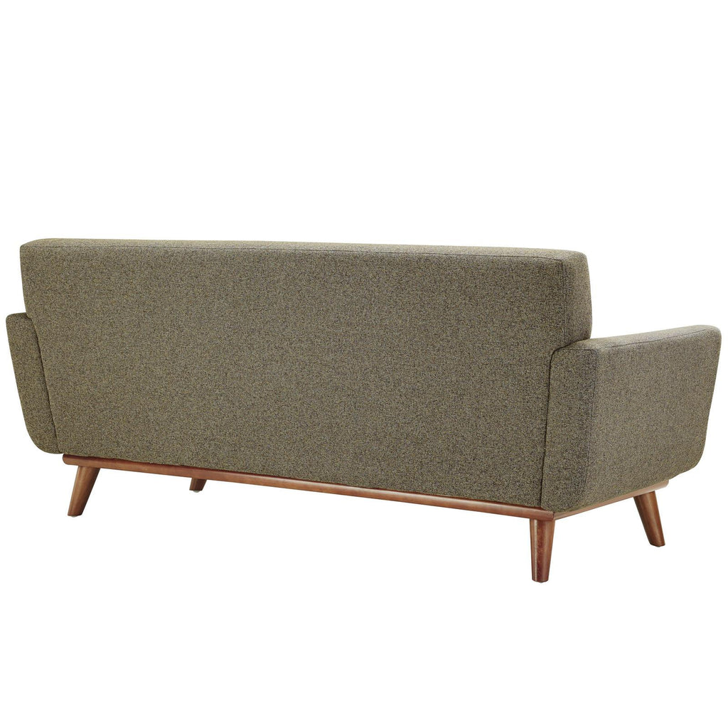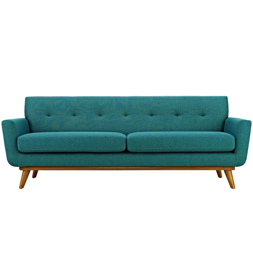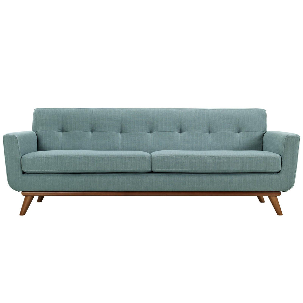 Gently sloping curves and large dual cushions create a favorite lounging spot. Whether plopping down after a long day at work, settling in with coffee and brunch, or entering a spirited discussion with friends, the Engage sofa is a welcome presence in your home. Seven tufted buttons create eye-catching appeal, adding depth that brings your sitting d�cor to center stage. Four cherry color rubberwood legs and frame supply a solid base to the comfortable upholstered material.