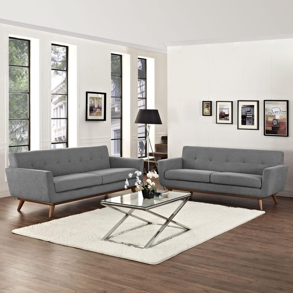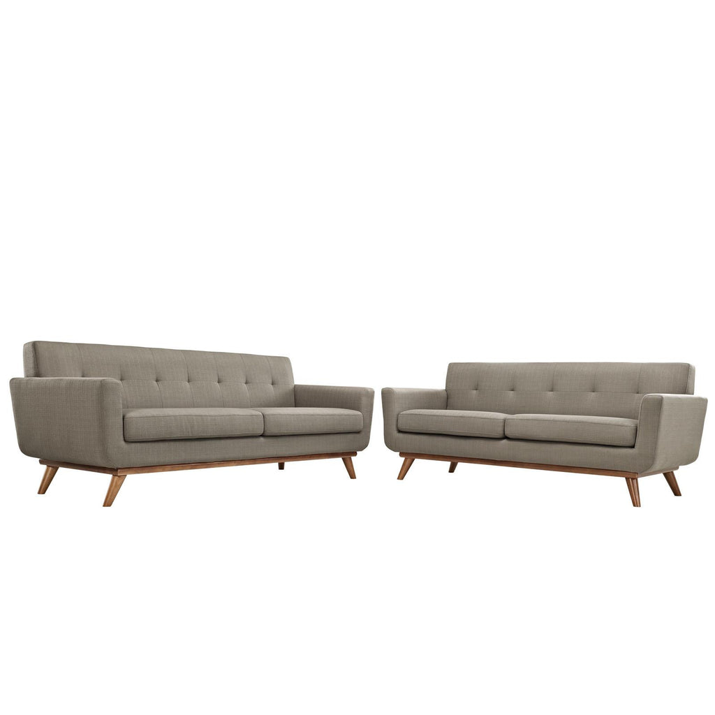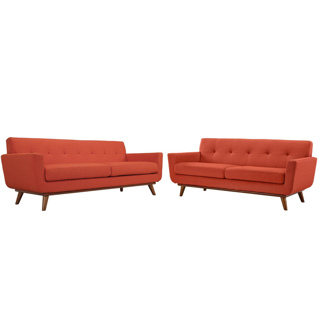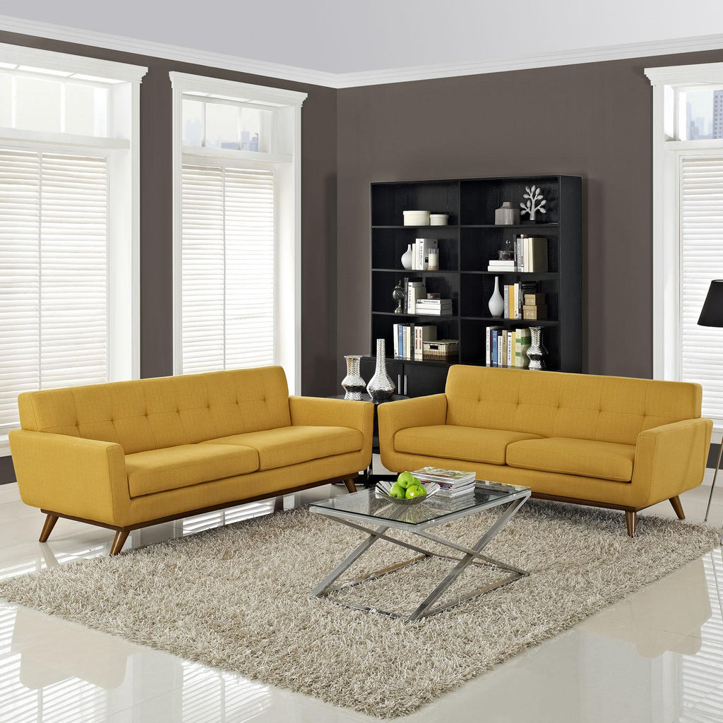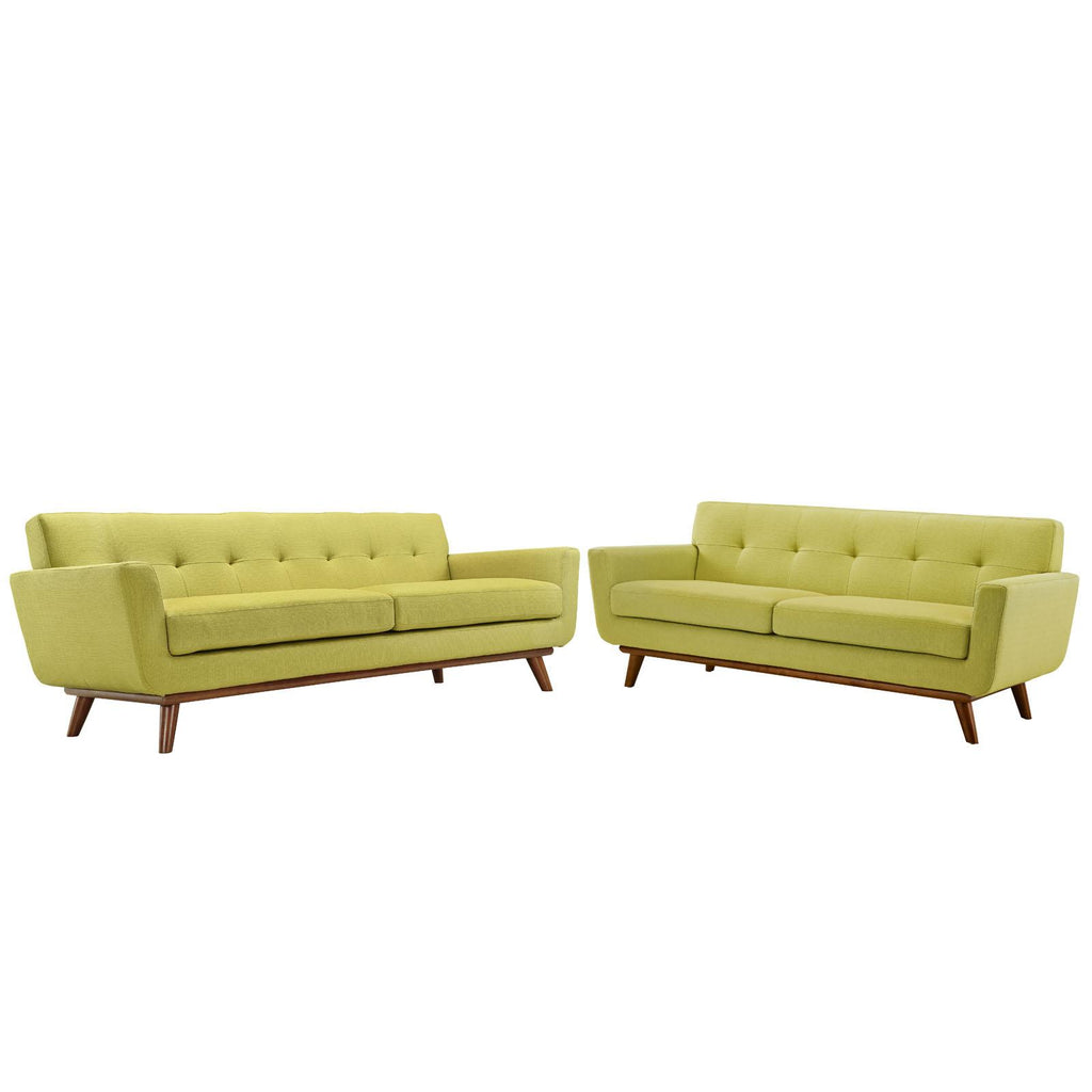Gently sloping curves and large dual cushions create a favorite lounging spot. Whether plopping down after a long day at work, settling in with coffee and brunch, or entering a spirited discussion with friends, the Engage sofa is a welcome presence in your home. Seven tufted buttons create eye-catching appeal, adding depth that brings your sitting d�cor to center stage. Four cherry color rubberwood legs and frame supply a solid base to the comfortable upholstered material.