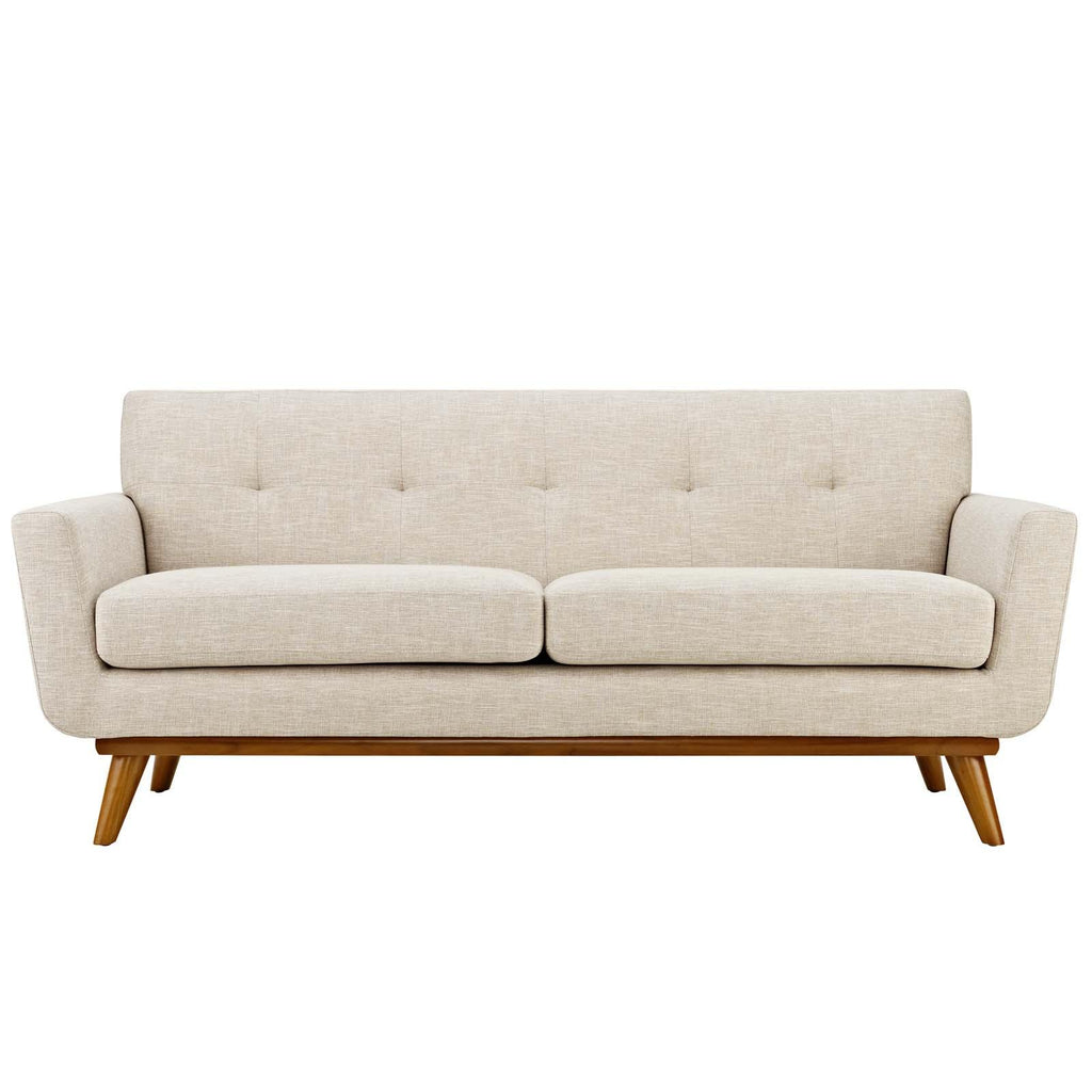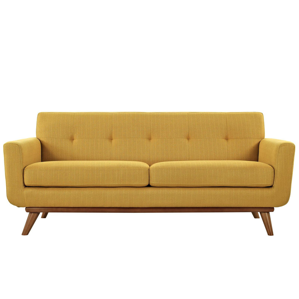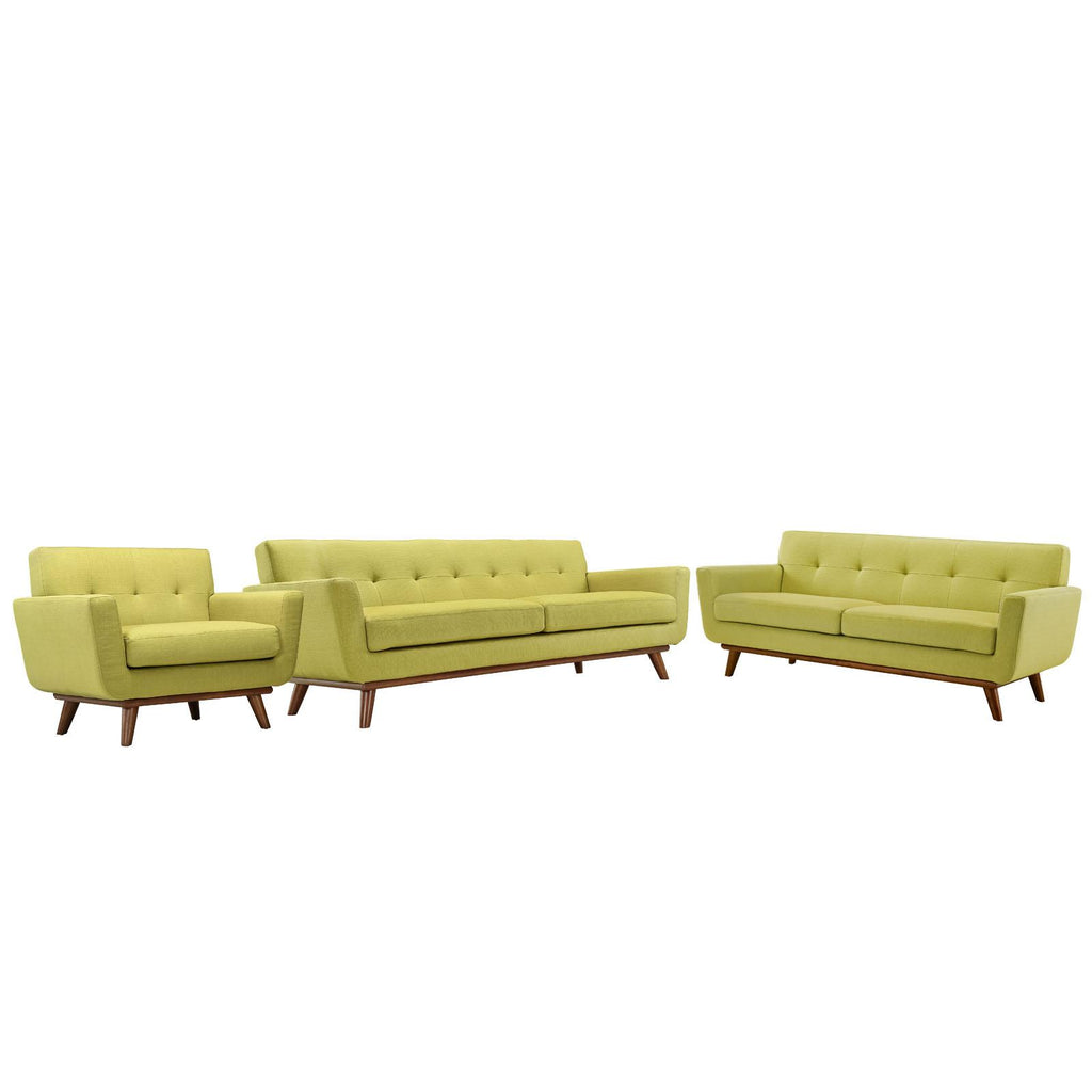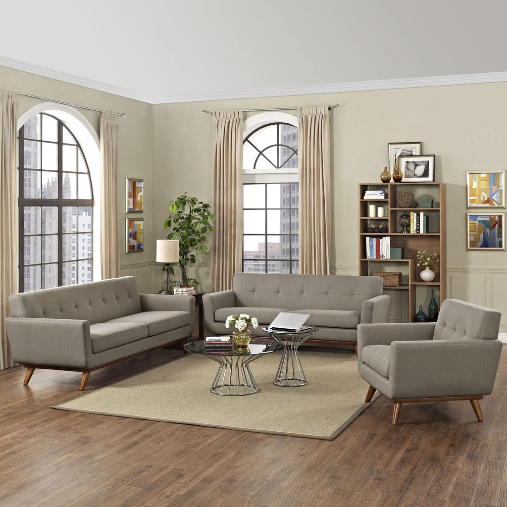 Gently sloping curves and large dual cushions create a favorite lounging spot with Engage Upholstered Fabric Button Tufted Sofa Furniture Series. Whether plopping down after a long day at work, settling in with coffee and brunch, or entering a spirited discussion with friends, the Engage Upholstered Fabric Button Tufted Sofa, Loveseat and Armchair set is a welcome presence in your home. Seven tufted buttons create eye-catching appeal, adding depth that brings your sitting d�cor to center stage. Four cherry color rubberwood legs and frame supply a solid base to the comfortably durable and stain-resistant upholstery. Set Includes: One - Engage Armchair with wood Legs One - Engage Loveseat with wood Legs One - Engage Sofa with wood Legs Cherry color rubberwood White plastic glides Polyester Blend Fabric Chair Weight Capacity - 440 lbs Overall Product Dimensions: 111"L x 123.5"W x 32.5"H Armchair Dimensions: 40"L x 33"W x 32.5"H Loveseat Dimensions: 78"L x 33"W x 32.5"H Sofa Dimensions: 33"L x 90.5"W x 32.5"H Armrest Dimensions: 4.5"W x 6.5"H Cushion Thickness: 6"H