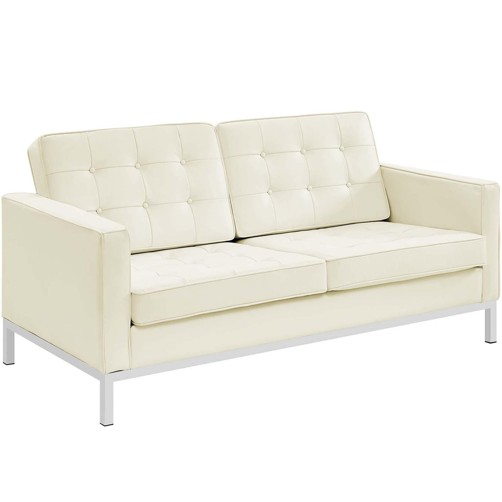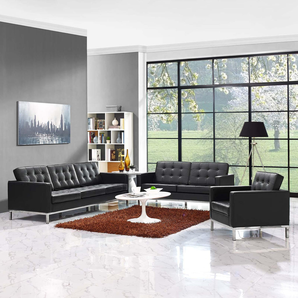 The mid-20th century was a time when hopes were at their highest. Technological developments were bustling forward, and the new world was just barely visible in the distance. But this time also presented a dilemma of sorts. The test of this forthcoming era was to be whether industry would foster comfort or stifle it. What makes the Loft series so complete? At first glance, it displays a pleasant linear design with an external tubular stainless steel frame. The back and seat are tufted and buttoned to enhance the overall richness of the piece. But can these aspects be said to define the totality of a classic? The answer then must be something profound. A thought that serves as representative of that era, while matching the sentiments of our present age. Our suggestion is that the Loft series conveys the potential of progress. From amidst the steel base, a comfortable seating experience is attained. From out of the exponential surge of technological growth, comes peace and solace. Perhaps this is why Loft is the sofa series of choice for so many Fortune 500 companies. Aside from its iconic feel, the set is symbolic of a time when technological innovation could do no wrong. When �faster� was seen only as something positive. The Loft series is the preferred choice for reception areas, living rooms, hotels, resorts, restaurants and other lounge spaces. Set Includes: One - Loft Armchair One - Loft Loveseat One - Loft Sofa Mid-Century Modern Sofa/Loveseat/Armchair Top Grain Genuine Leather Tufted Seat and Back with Buttons Stainless Steel Frame Generously padded foam cushions Foot caps to prevent scratching Overall Armchair Dimensions: 30.5"L x 30.5"W x 30.5"H Seat Dimensions: 24"W x 16"H Armrest Dimensions: 4"W x 23"H Backrest Height: 14.5"H Cushion Thickness: 4"H Armrest Height from Seat: 7"H Overall Loveseat Dimensions: 30.5"L x 63"W x 30.5"H Seat Dimensions: 55.5"W x 16"H Armrest Dimensions: 4"W x 23"H Backrest Height: 14.5"H Cushion Thickness: 4"H Armrest Height from Seat: 7"H Overall Sofa Dimensions: 30.5"L x 91"W x 30.5"H Seat Dimensions: 83.5"W x 16"H Armrest Dimensions: 4"W x 23"H Backrest Height: 14.5"H Cushion Thickness: 4"H Armrest Height from Seat: 7"H Overall Product Dimensions: 30.5"L x 184.5"W x 30.5"H