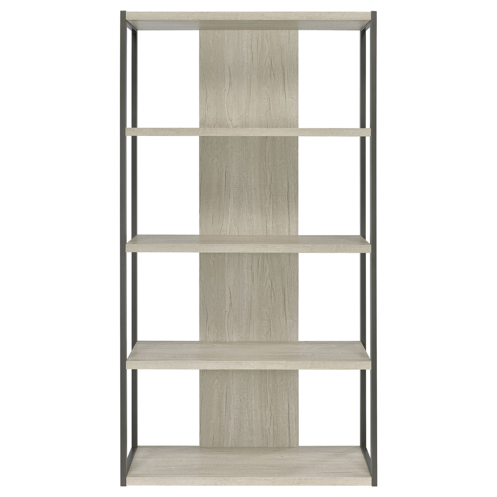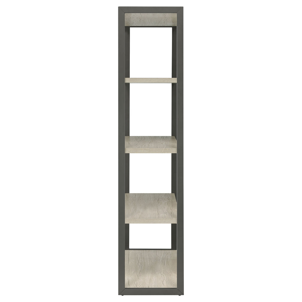 Bring open, modern style to your home office or living area with this tall contemporary bookshelf. Four spacious shelves in a soft whitewashed grey finish offer ample room for books, decorative pieces, and essentials. A sleek grey metal frame outlines the structure, lending industrial contrast to the wood tones. The flush bottom shelf enhances stability, while the engineered wood construction with a laminate veneer ensures long-lasting durability and easy maintenance for everyday use. Key Features: • Contemporary bookcase features four spacious open display shelves • Whitewashed grey engineered wood offers neutral, modern appeal • Dark grey finished frame provides clean contrast and support • Flush bottom shelf ensures floor-level stability and balance • Constructed with engineered wood and laminate veneer for longevity • Perfect for books, décor, or storage in home offices or living spaces