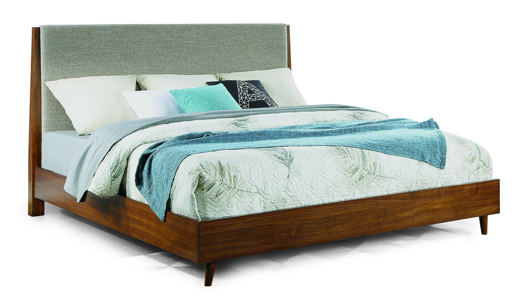 Slumber in sophistication with this Ludwig king bed which features a sleek, upholstered headboard in a silt-colored fabric to harmoniously blend with any dŽcor. Anchored with clean lines and tapered, splayed legs in classic mid-century styling, this bed is accentuated by a warm, walnut finish and chamfered edges for a sophisticated look. Also available in sizes from full to California King, the bed is smaller scaled to perfectly fit in any size bedroom. Timeless design and high-quality construction ensure the Ludwig bed can be enjoyed for generations to come.