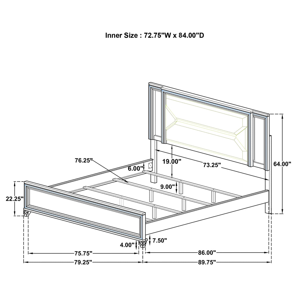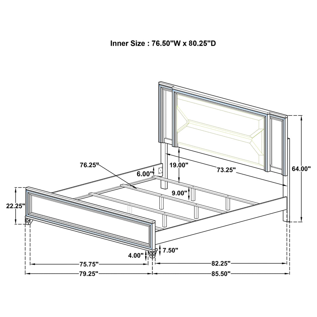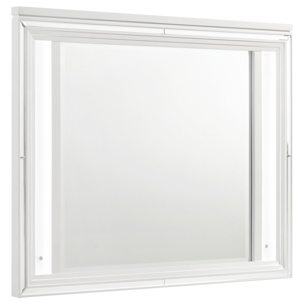 Create a cohesive and luxurious look in your bedroom with this bedroom set. Featuring a bed, nightstand, dresser, mirror, and optional chest, each piece is designed with a modern Italian aesthetic. The white finish, picture framed recessed panels, and embossed herringbone graphic patterns exude sophistication, while the mirror framing, acrylic legs, and polished chrome metal hardware add a touch of opulence. This set offers both style and functionality, making it the perfect choice for your elegant bedroom. Key Features: • Four-piece queen bedroom set with modern Italian design • White finish with picture framed recessed panels and embossed herringbone graphic patterns • Touch LED lights in the headboard and mirror provide added convenience and a modern touch to your bedroom • Nightstand with cord management access and dresser with removable jewelry tray • Mirror framing, acrylic legs, and polished chrome metal hardware