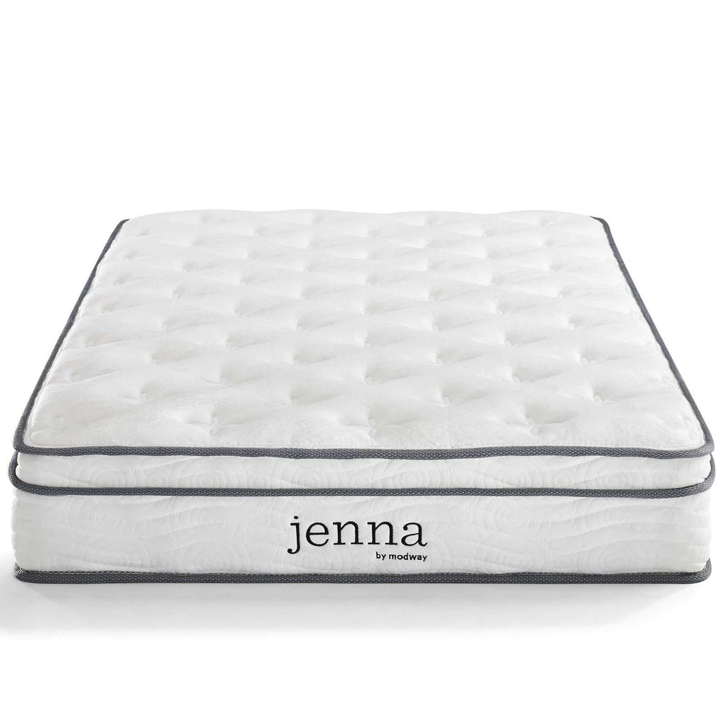 Enjoy rejuvenated sleep with the Jenna 8� Innerspring Mattress. Jenna features individually wrapped pocket coils that isolate motion between sleeping partners. Responsive to the needs of side, back, and stomach sleeping styles, Jenna�s 7� tall coils come padded underneath two layers of foam for maximum comfort. Complete with a quilted polyester tight-top surface, Jenna relieves pressure on hips, back and shoulders, while delivering a smooth and even feel night after night. Jenna is a firm innerspring mattress that avoids the sag and sink of foam and air mattresses, and ships compressed and rolled into a box for easy delivery.
