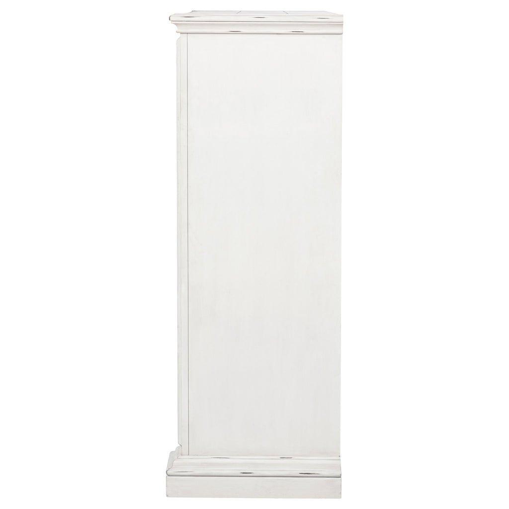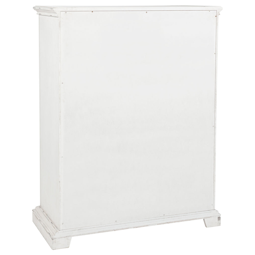 Timeless in spirit and refined in detail, this five-drawer chest evokes quiet charm and lasting beauty. A vintage white finish softens its stately frame, while molded edges and antique bronze ring pulls add character and depth. Designed with thoughtful craftsmanship, it offers spacious storage and smooth functionality. Built from poplar, engineered wood, and veneer, it brings elegance and purpose to the bedroom. Key Features: • Five-drawer chest with classic molding and clean lines for graceful bedroom storage • Vintage white finish offers a soft, aged look with traditional character • Antique bronze ring pulls add warmth and contrast to the light wood tone • Spacious drawers glide smoothly and are crafted with thoughtful construction • Top drawer is felt lined to protect delicate accessories and essentials • Built from poplar, engineered wood, and veneer for enduring style and strength