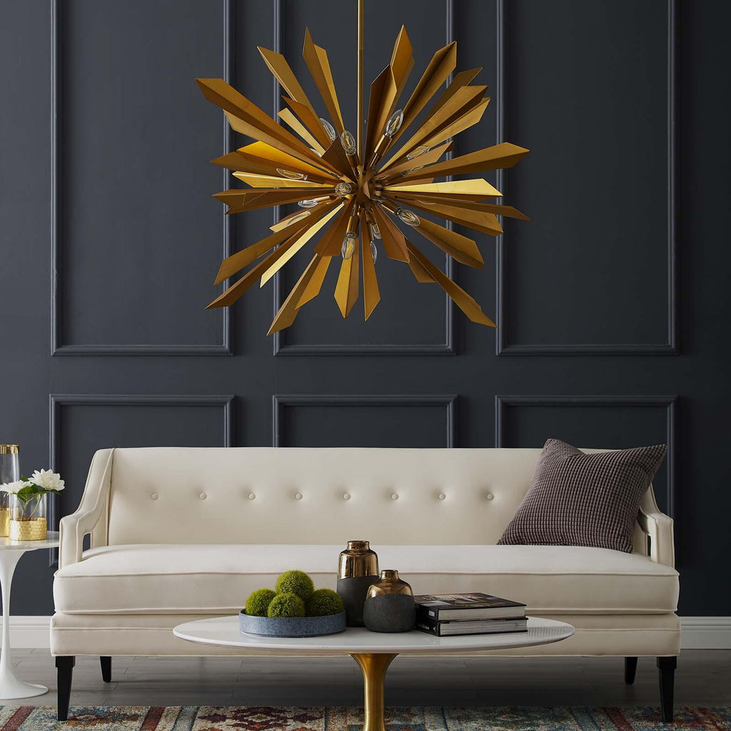 Make a striking statement with the Pervade Starburst Pendant Light Chandelier. Featuring an updated mid-century style design, Pervade's dazzling array of angular antique brass leaves shoot out of the spherical center at varying lengths. Illuminate any living room, bedroom, entryway, or dining space with a warm, golden glow, as sixteen inset light sockets reflect off the sculptural form of this starburst pendant light chandelier. Suspended from a sleek antique brass rod with a flush wall mount, Pervade requires sixteen E12 25W light bulbs (not included).