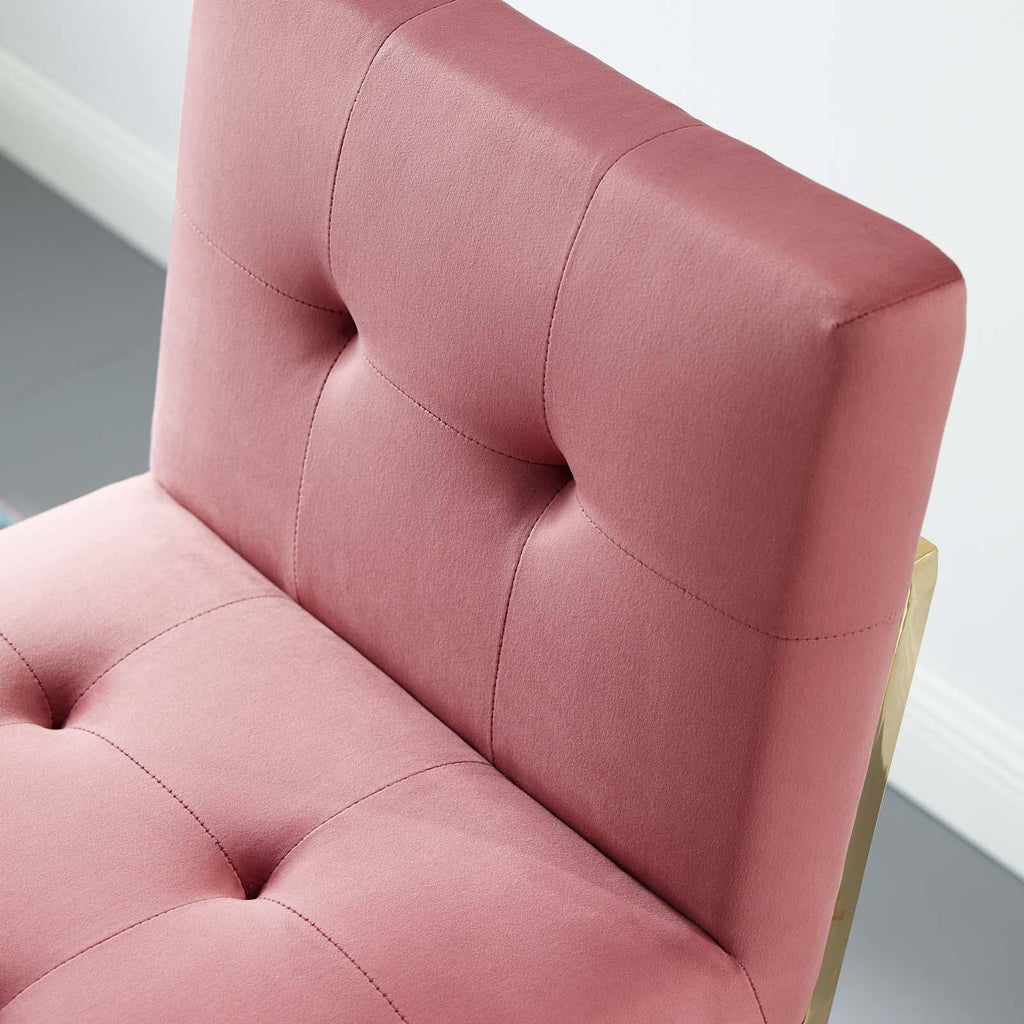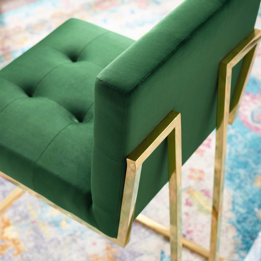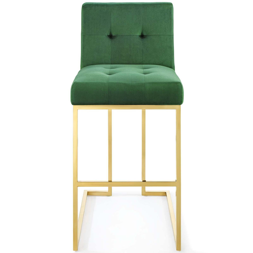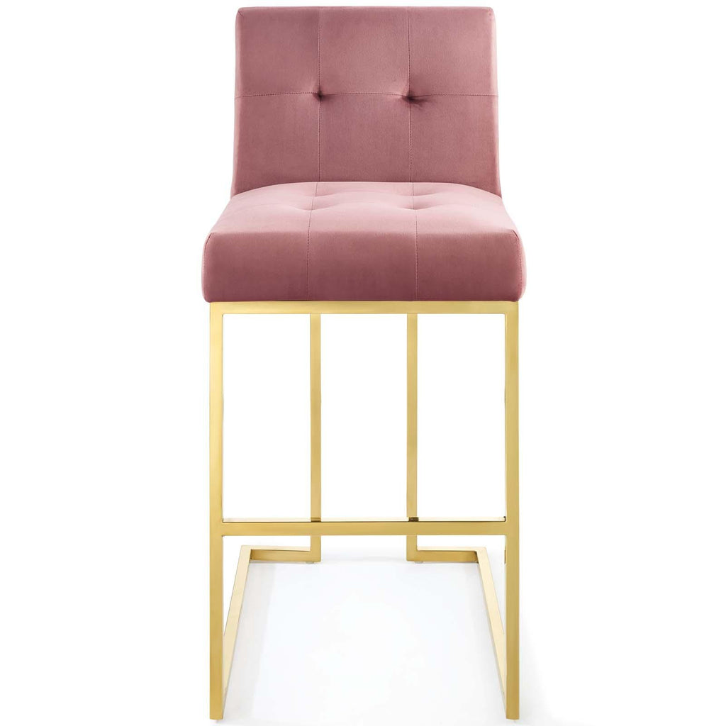 Maximize your dining room decor with Privy. A glam deco bar stool, Privy features soft and stain-resistant performance velvet upholstery for a streamlined modern look. This stylish bar stool rests atop a sleek gold stainless steel geometric base with a footrest that will elevate your dining and bar experience. No assembly required. Bar Stool Weight Capacity: 331 lbs.