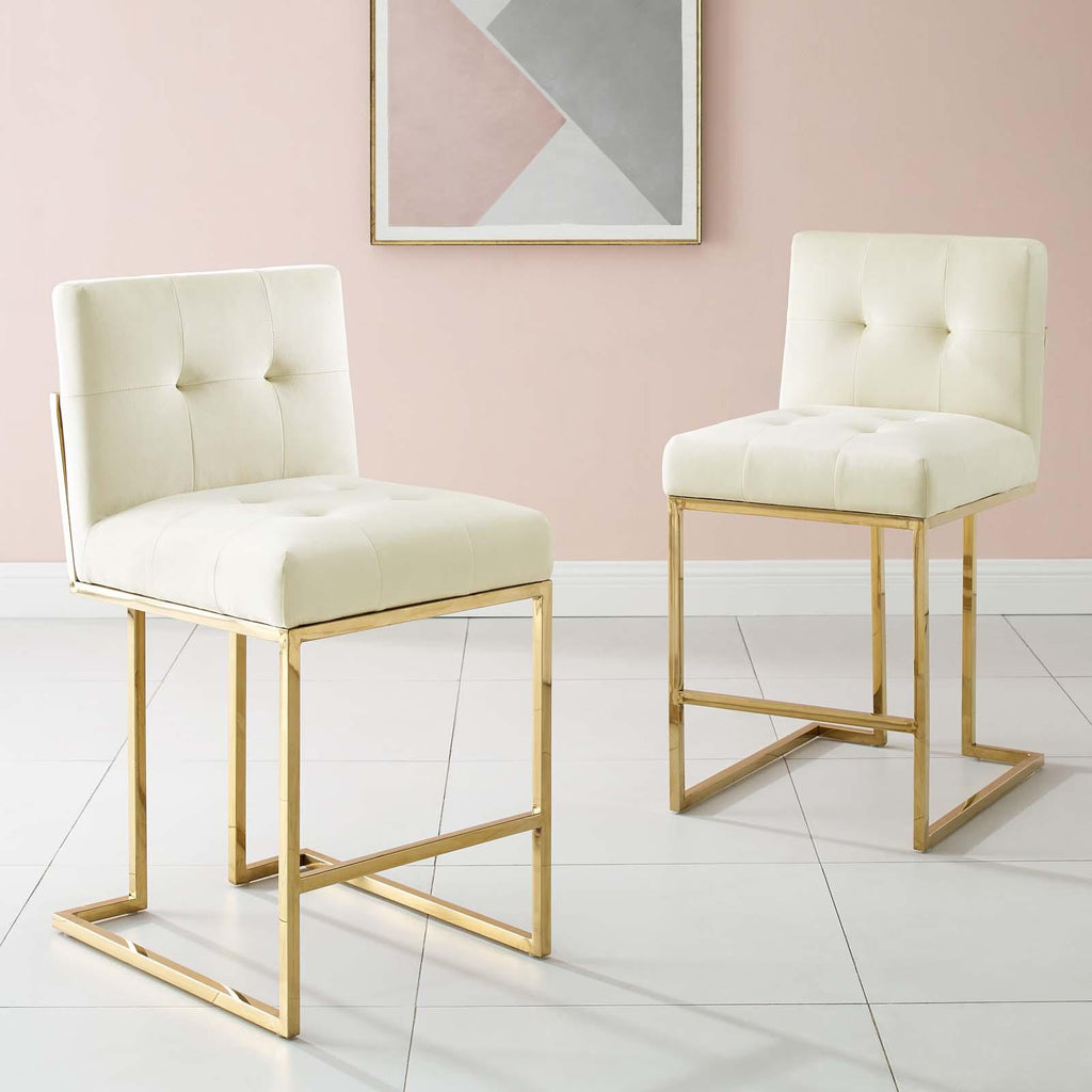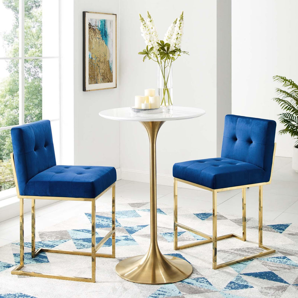 Maximize your dining room decor with Privy Counter Stool Set of 2. A glam deco kitchen counter stool, Privy features soft and stain-resistant performance velvet upholstery for a streamlined modern look. This counter height stool rests atop a sleek gold stainless steel geometric base with a footrest that will elevate your dining experience. No assembly required.