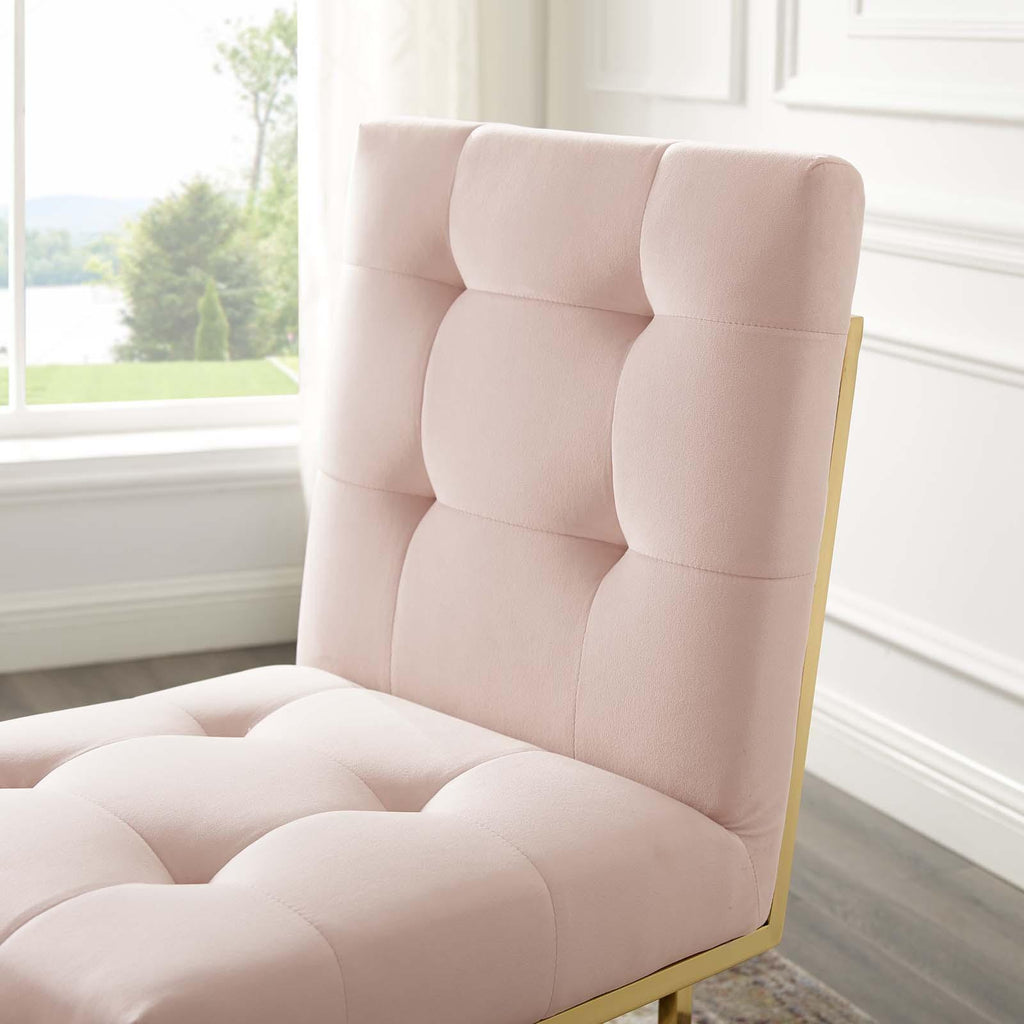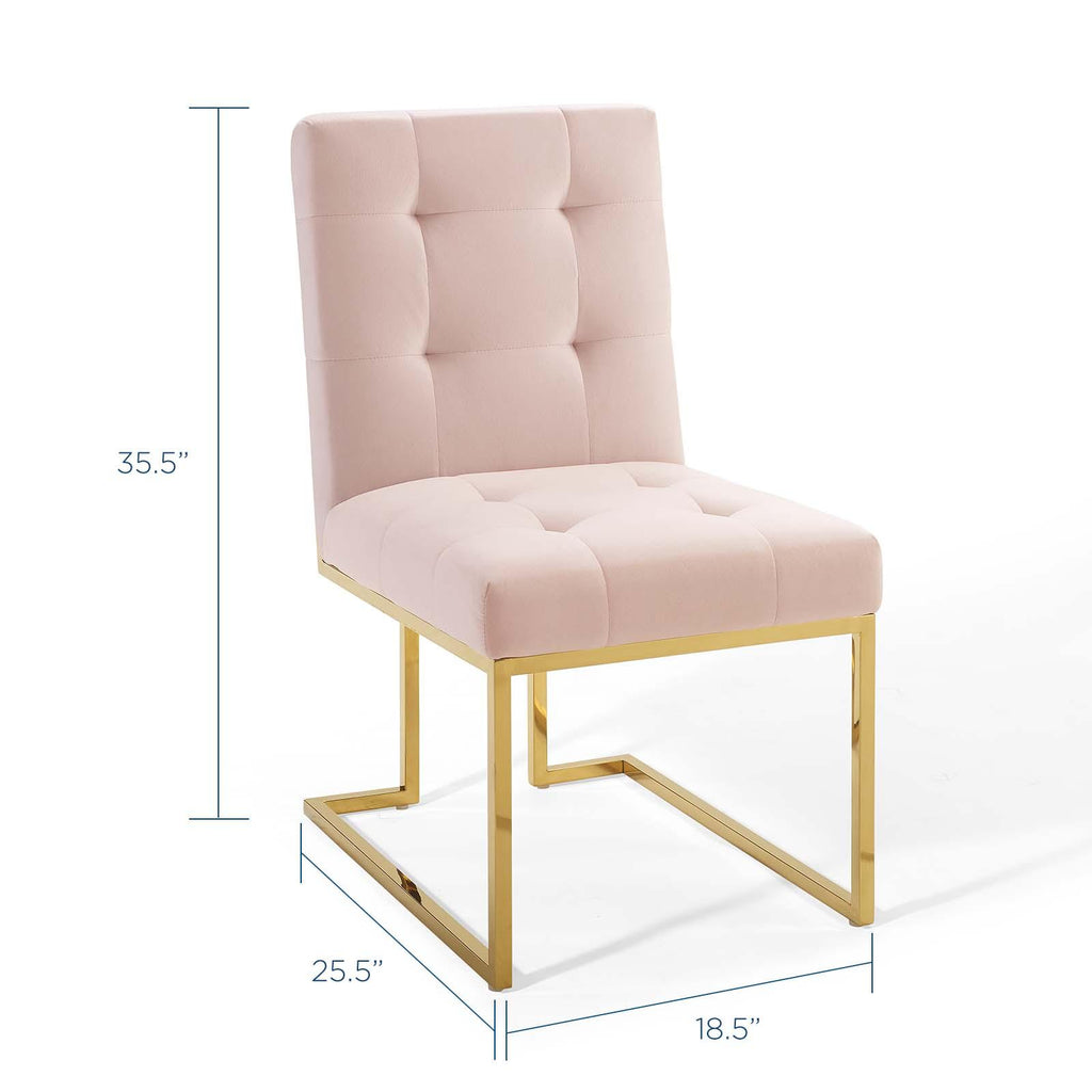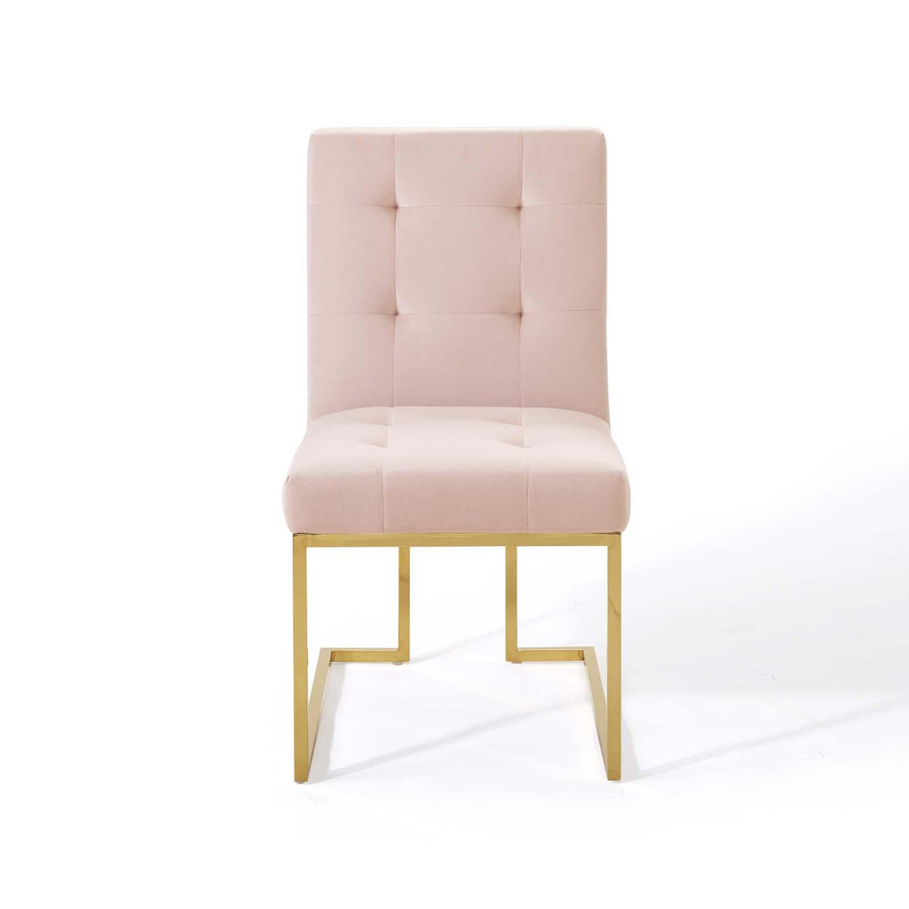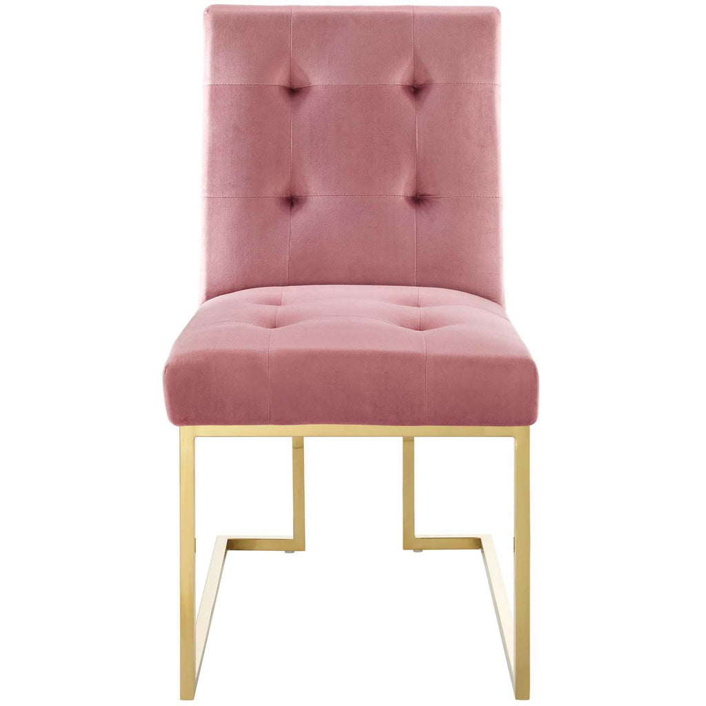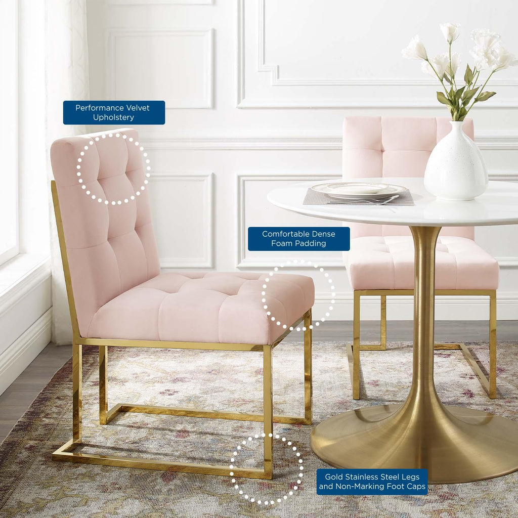 Maximize your dining room decor with Privy. A glam deco dining chair, Privy features soft and stain-resistant performance velvet polyester upholstery for a streamlined modern look. This modern dining chair rests atop a sleek gold stainless steel geometric base that will elevate your dining experience. No assembly required. Chair Weight Capacity: 331 lbs.