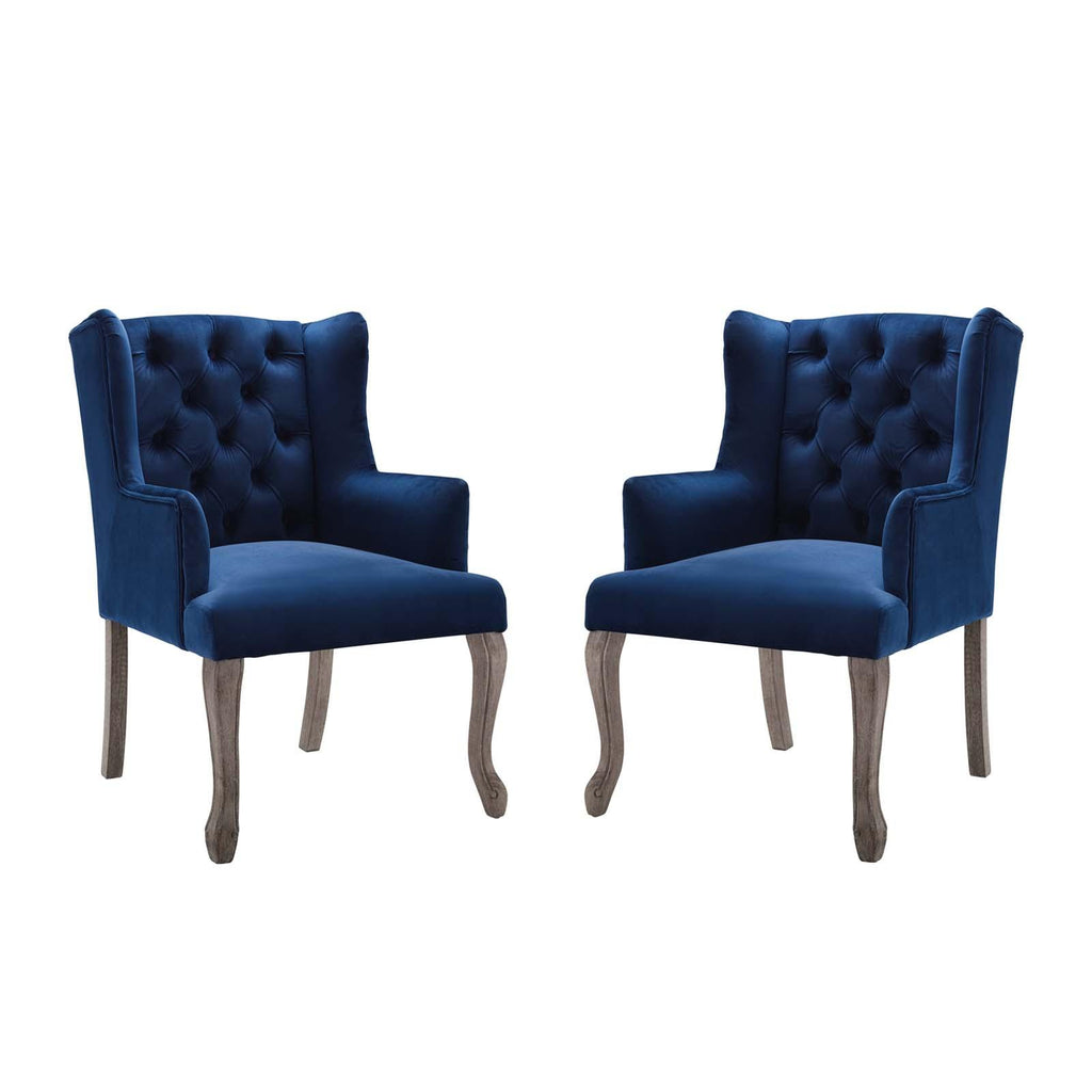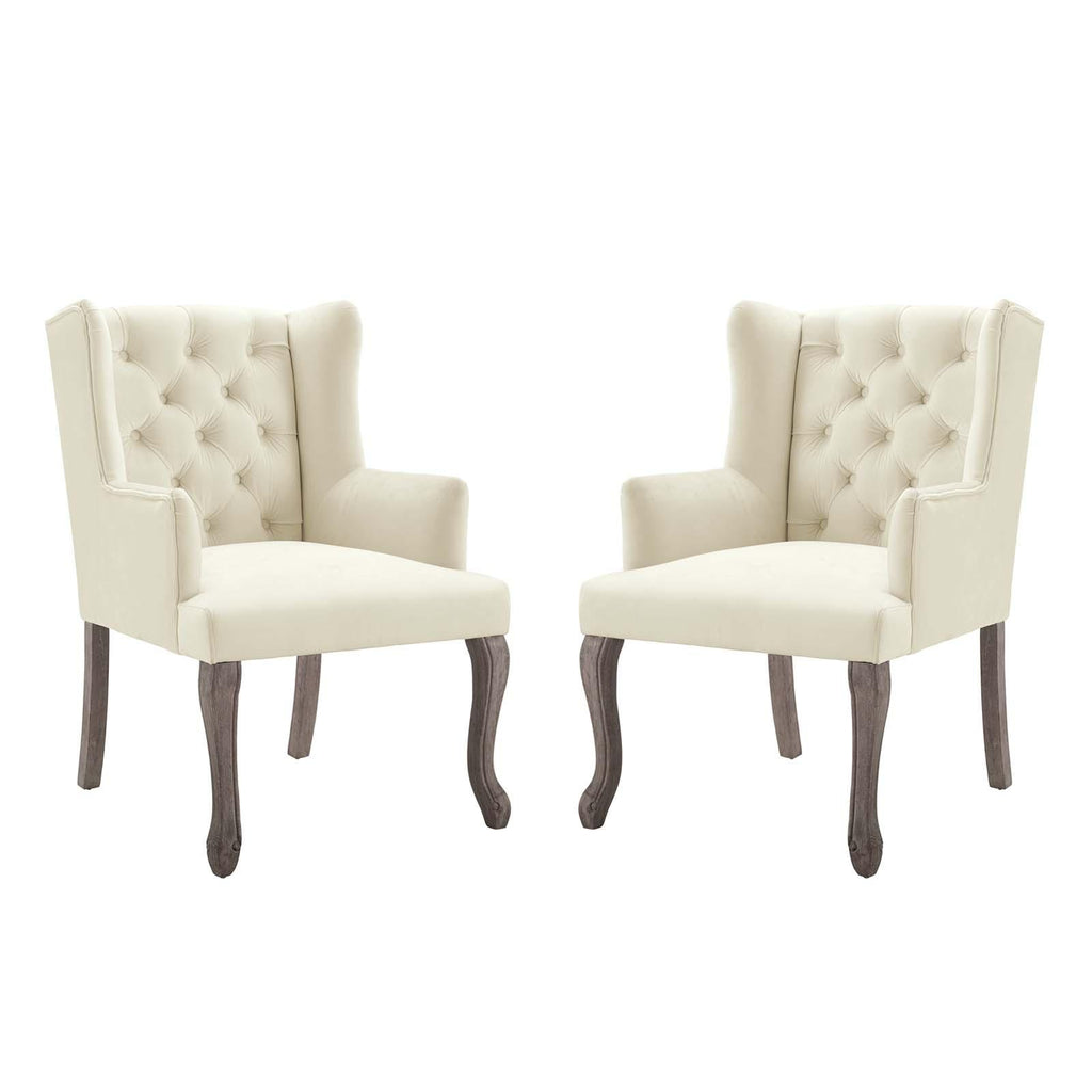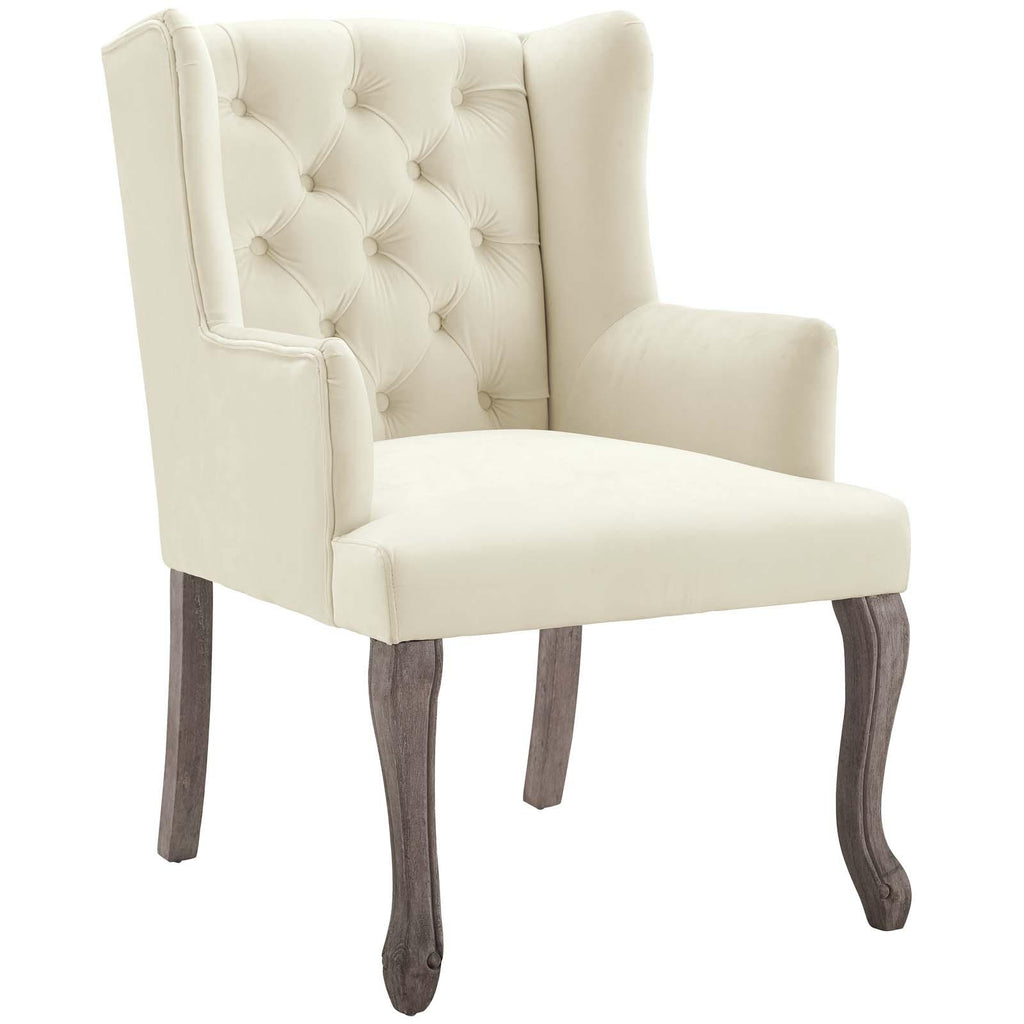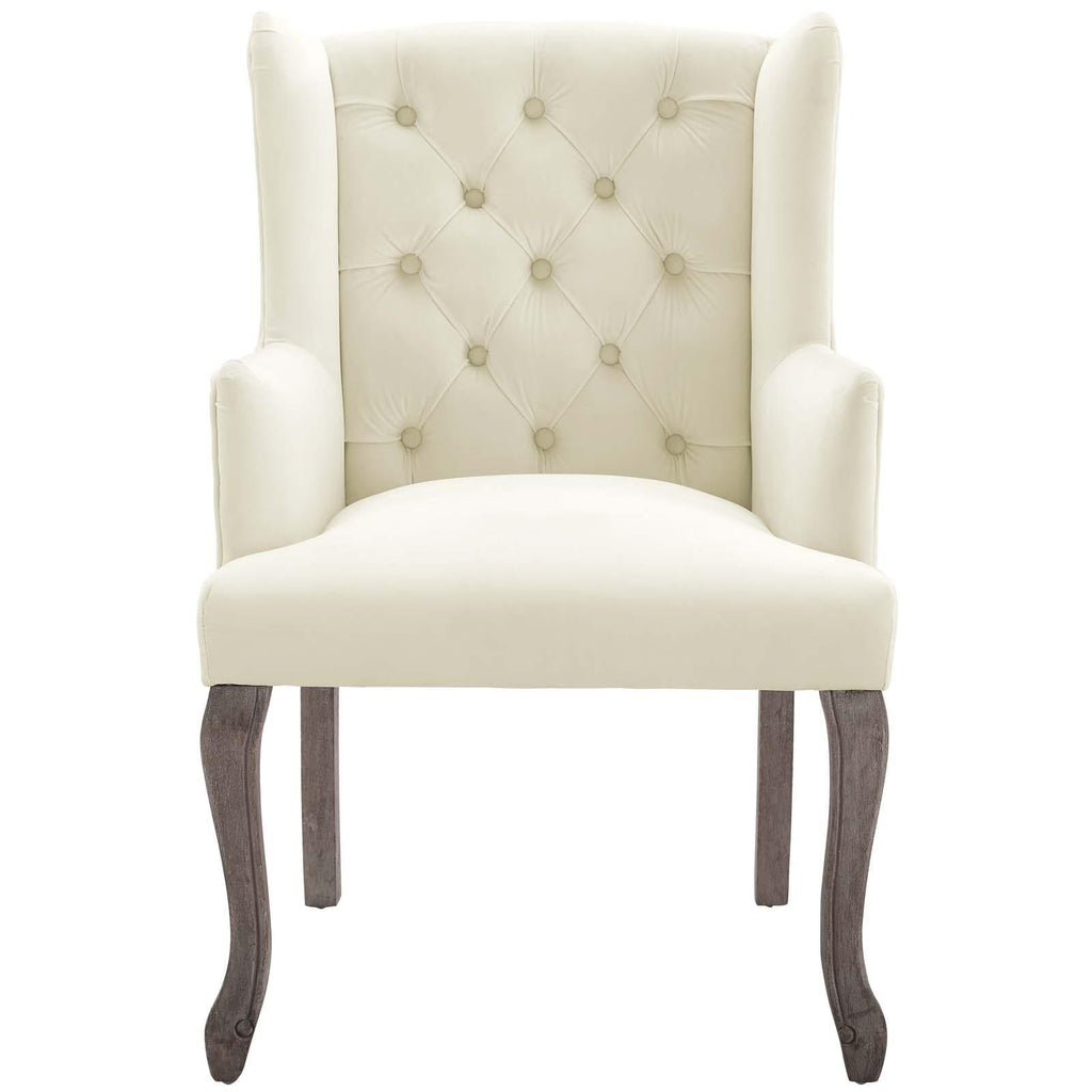 Elevate your living room, entryway, bedroom or home office decor with the Realm French Vintage Performance Velvet Dining Armchair. Elegantly designed with deep-button tufting, weathered wood cabriole legs with chiseled artisan detail, this wingback chair makes a chic statement with timeless detail and modern farmhouse intrigue. Finely upholstered in stain-resistant performance velvet with dense foam padding, charming French piping, and a sinuous spring support system for exceptional comfort, Realm creates a cozy spot to sit back and relax. Realm includes plastic foot caps. Armchair Weight Capacity: 300 lbs.