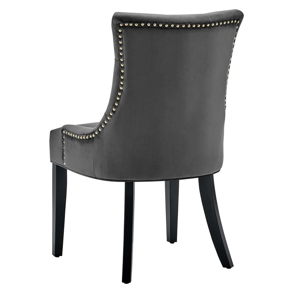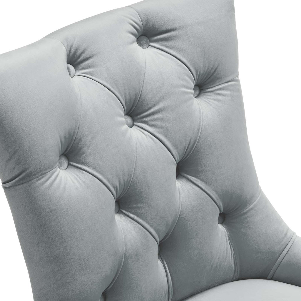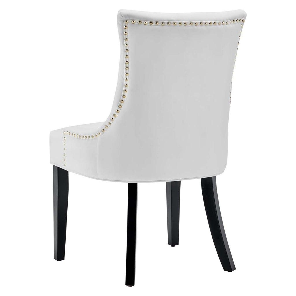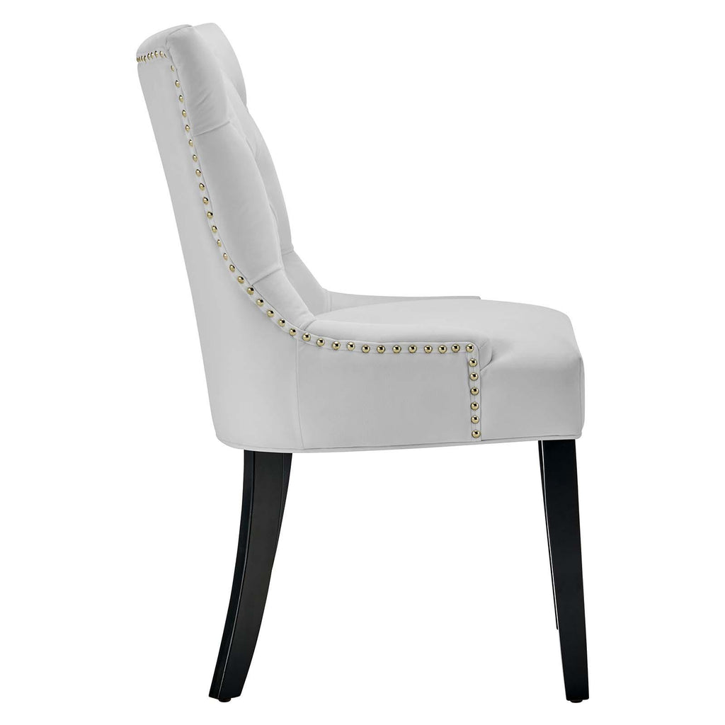 Transport your dining room d�cor to a simpler time with the Regent Tufted Button Upholstered Performance Velvet Dining Chair. With a chic and elegant look, the Regent Accent Chair features finely tufted buttons and studded nailhead trim that enhance any dining room, living room, lounge room, or office decor with timeless elegance. The Regent Dining Chair has a seat generously padded with foam and a spring coil system with webbing for long-lasting comfort. Covered in stain-resistant performance velvet upholstery, the Regent Dining Room Side Chair comes with non-marking foot caps, tapered wood legs, and is a masterful choice for modern and traditional dining and living rooms. Chair Weight Capacity: 500 lbs.