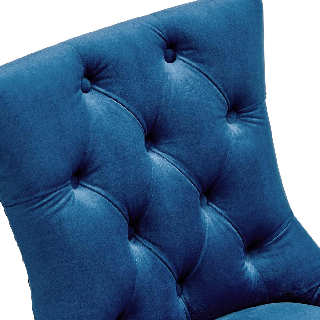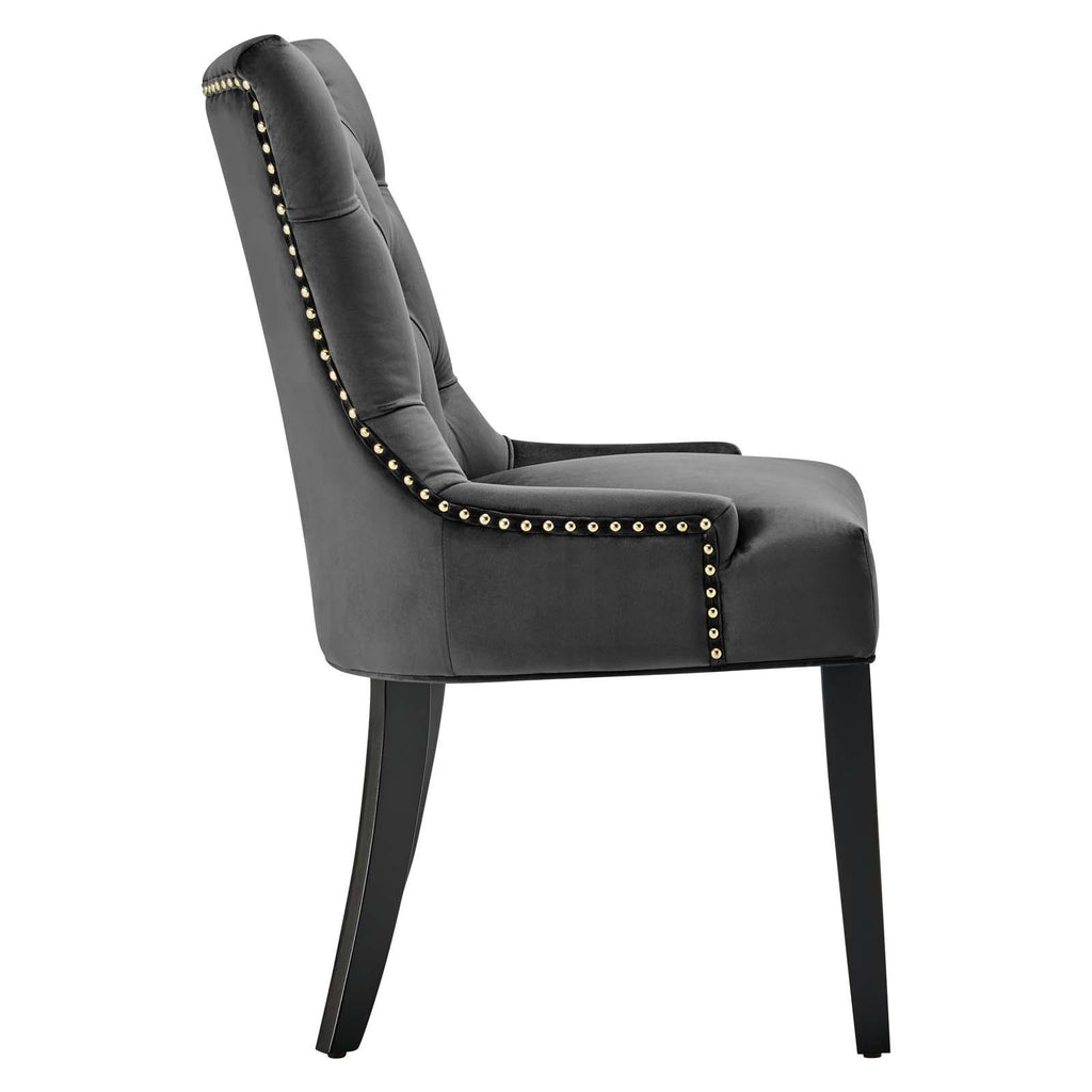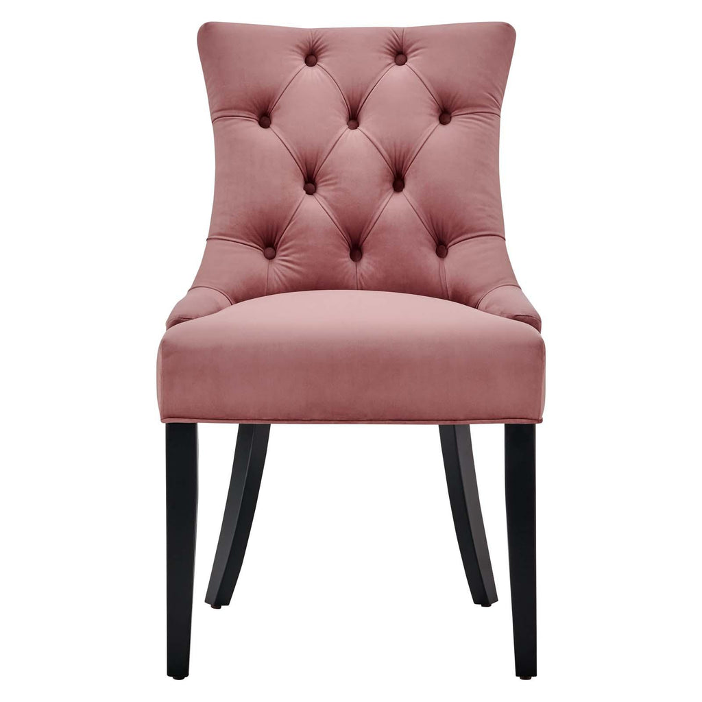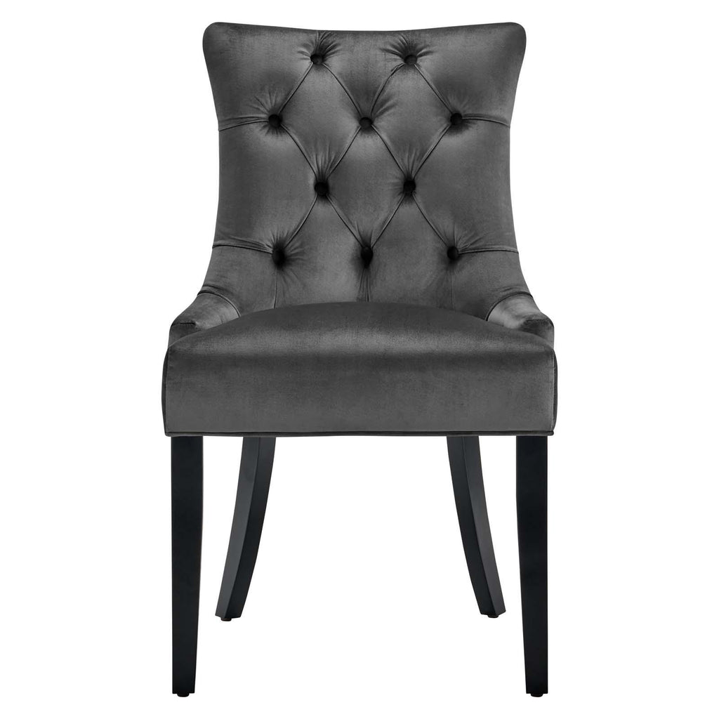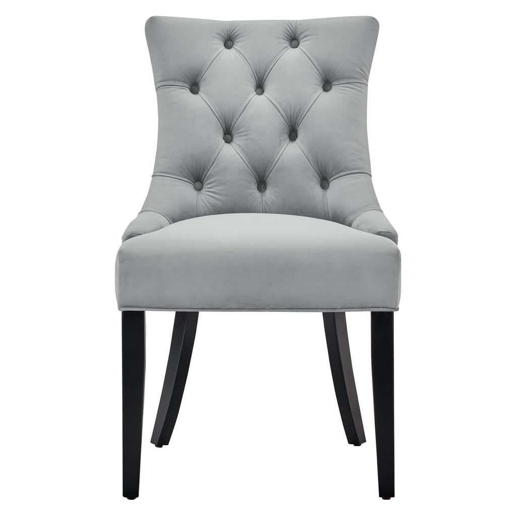 Transport your dining room d�cor to a simpler time with the Regent Tufted Button Upholstered Performance Velvet Dining Chair. With a chic and elegant look, the Regent Accent Chair features finely tufted buttons and studded nailhead trim that enhance any dining room, living room, lounge room, or office decor with timeless elegance. The Regent Dining Chair has a seat generously padded with foam and a spring coil system with webbing for long-lasting comfort. Covered in stain-resistant performance velvet upholstery, the Regent Dining Room Side Chair comes with non-marking foot caps, tapered wood legs, and is a masterful choice for modern and traditional dining and living rooms. Chair Weight Capacity: 500 lbs.
