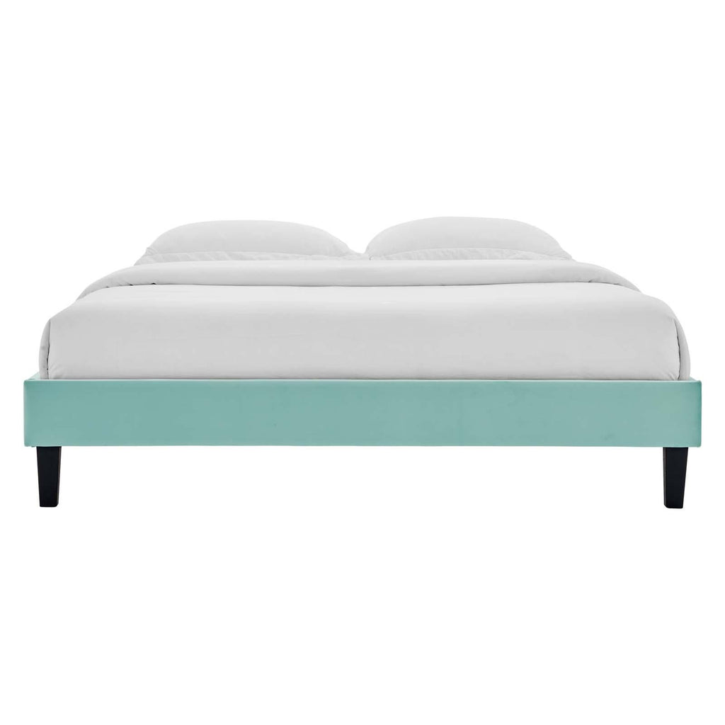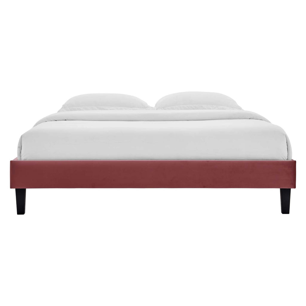 Transform your bedroom decor with the subtle glam deco style of the Reign Performance Velvet Queen Platform Bed Frame. Covered in soft, stain-resistant performance velvet, this upholstered bed boasts rich texture on the simple design of the sturdy side rails. Resting atop tapered black wood legs, the queen size bed frame is a sturdy mattress foundation for memory foam, latex, innerspring, and hybrid mattresses. Eliminating the need for a box spring, this platform bed is complete with a poplar wood slat support system, a reinforced center beam, and supporting legs for lasting stability. Compatible with a variety of queen headboard designs, this queen platform bed also makes a striking statement as a stand-alone piece in the master bedroom or guest bedroom. Mattress not included. Assembly required. Queen Bed Frame Weight Capacity: 800 lbs.