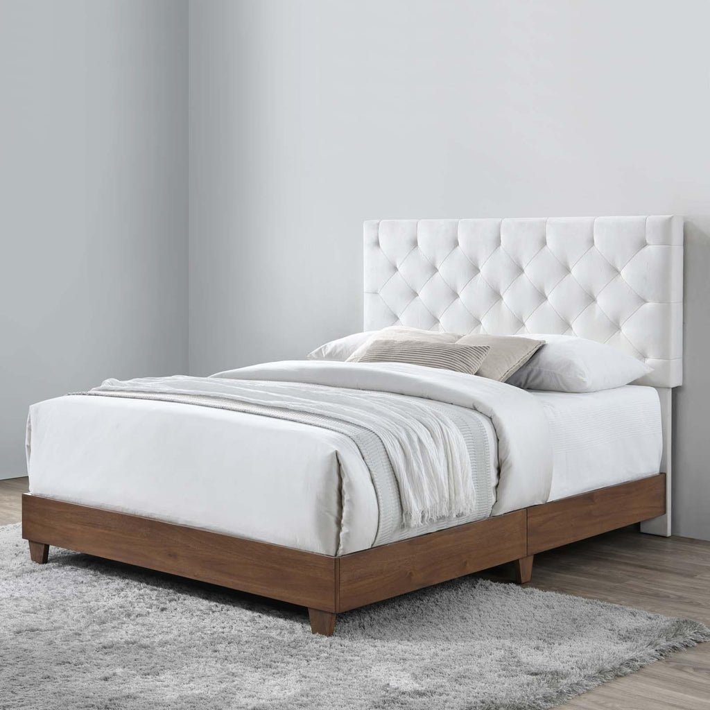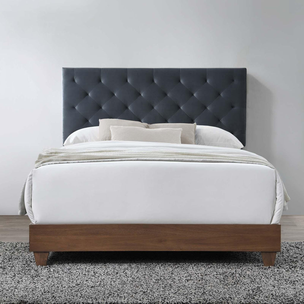 Manifest the extraordinary in your bedroom decor with the Rhiannon Diamond Tufted Performance Velvet Upholstered Queen Bed. Solidly constructed from MDF and wood, Rhiannon Queen Bed has tapered legs and a walnut veneer. Rhiannon�s sturdy frame comes with dual support planks, soft and durable stain-resistant performance velvet upholstery, and a padded tufted diamond pattern headboard, for enhanced comfort and stability. Claim the elegance of Rhiannon Queen Bed for your master suite or guest room. This queen panel bed has a fixed position headboard, requires assembly and box spring. Headboard included. Spot clean as needed. Bed Weight Capacity: 800 lbs.