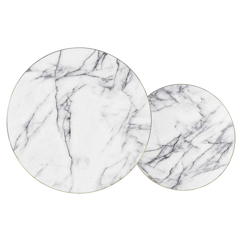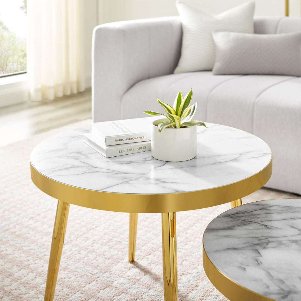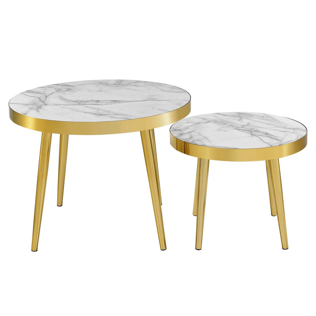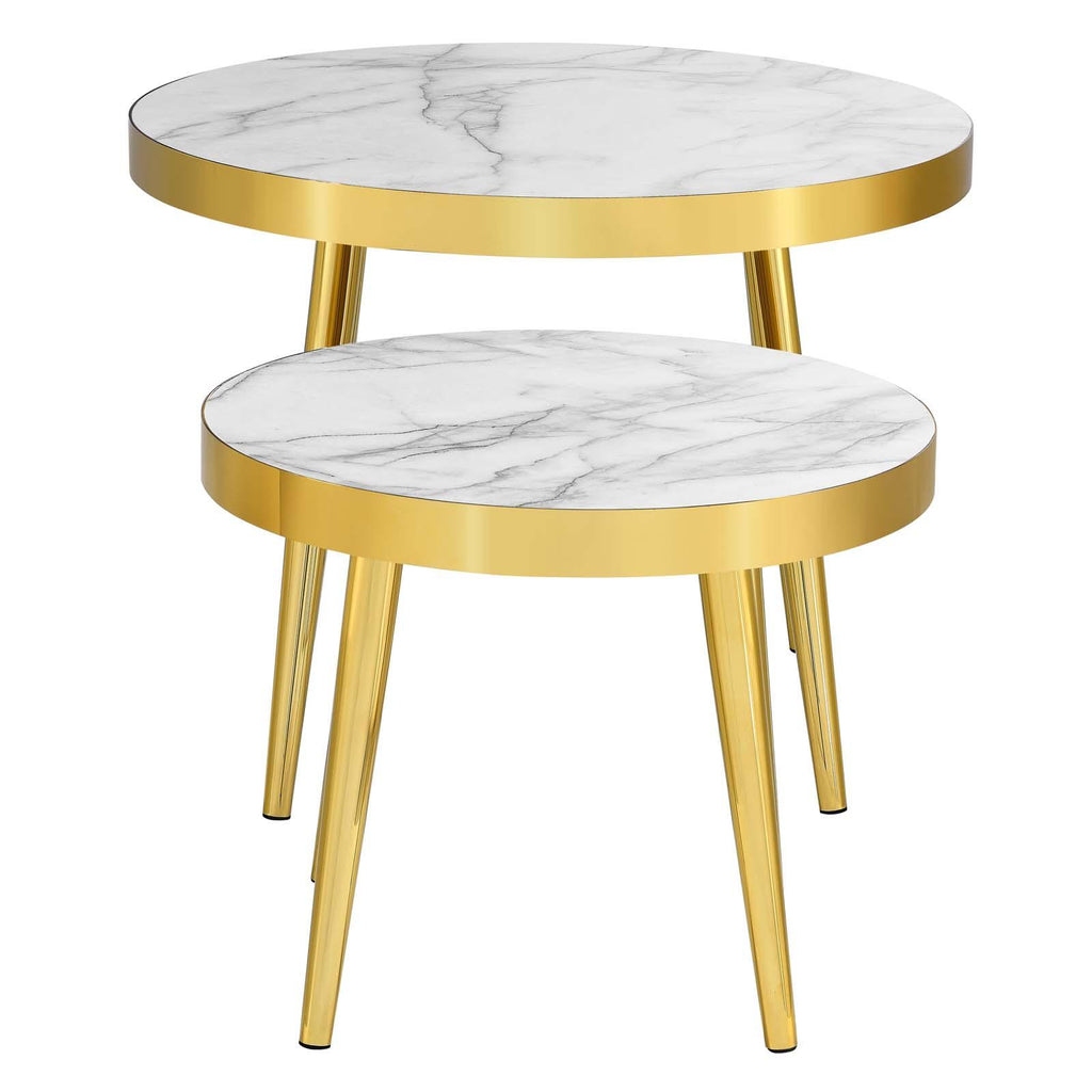 Evoke purpose and meaning with retro design style with the Solana Nesting Tables. A glamorous update to a living room, sitting area, or bedroom space, these side tables dazzle the eye with gold metal accents, faux marble detail, and a round organic shape. Nestling beneath one another or standing strong in separate areas of the house, these end tables rest atop splayed, tapered legs with gold stainless steel frames and feature MDF tabletops with a finish that resembles the intricacy of marble stone. The perfect place to rest a drink or current read, these nesting tables are more than just functional complementing mid-century, modern, vintage, and glam deco decor styles. Assembly required.