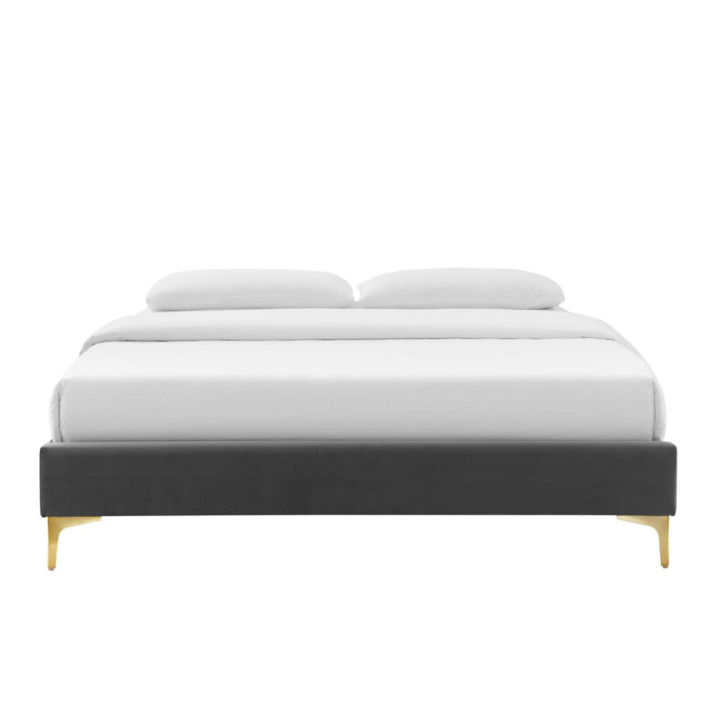 Uplift your master bedroom or guest bedroom decor with the Sutton Performance Velvet Full Bed Frame. A Full size bed frame covered in stain-resistant performance velvet, this upholstered bed frame is a sturdy mattress foundation for memory foam, innerspring, latex, and hybrid mattresses. Eliminating the need for a box spring, the MDF frame of this Full bed is complete with a wood slat support system crafted with poplar for lasting durability and support. This slatted bed frame rests on gold metal legs with non-marking foot caps and includes a reinforced center beam with two support legs for enhanced stability. The Sutton Bed Frame is compatible with a variety of different headboard styles, or makes a statement as a stand-alone piece in the bedroom. Bed frame interchangeable with Paige, Alyson, Angela, Veronique, Evelyn, Dawn, Cecilia, Lucia, Rosalind, Delilah, Greta, Louisa, Eloise, Daisy, Sadie, Sloane, Fallon, and Lizzy. Mattress not included. Assembly required. Full Size Bed Frame Weight Capacity: 800 lbs.