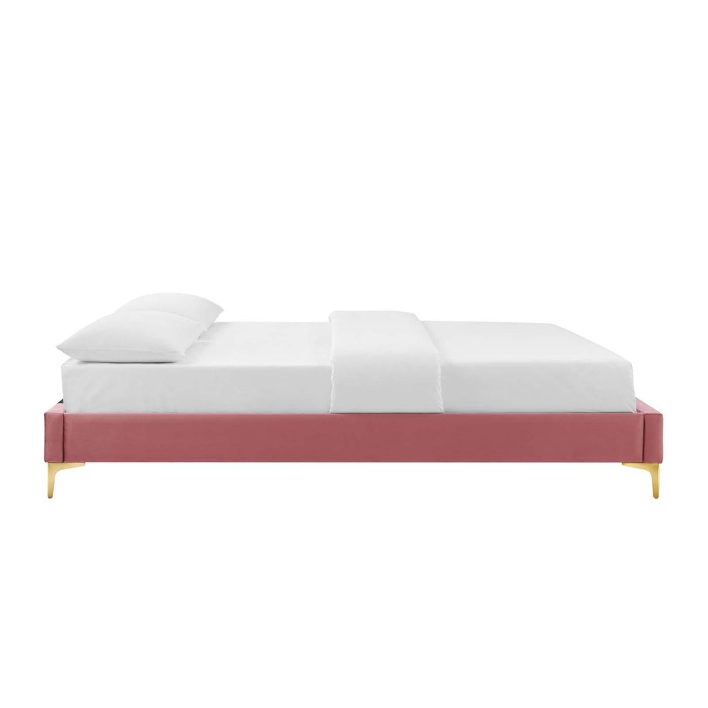 Uplift your master bedroom or guest bedroom decor with the Sutton Performance Velvet King Bed Frame. A King size bed frame covered in stain-resistant performance velvet, this upholstered bed frame is a sturdy mattress foundation for memory foam, innerspring, latex, and hybrid mattresses. Eliminating the need for a box spring, the MDF frame of this King bed is complete with a wood slat support system crafted with poplar for lasting durability and support. This slatted bed frame rests on gold metal legs with non-marking foot caps and includes a reinforced center beam with two support legs for enhanced stability. The Sutton Bed Frame is compatible with a variety of different headboard styles, or makes a statement as a stand-alone piece in the bedroom. Bed frame interchangeable with Paige, Alyson, Angela, Veronique, Evelyn, Dawn, Cecilia, Lucia, Rosalind, Delilah, Greta, Louisa, Eloise, Daisy, Sadie, Sloane, Fallon, and Lizzy. Mattress not included. Assembly required. King Size Bed Frame Weight Capacity: 800 lbs.