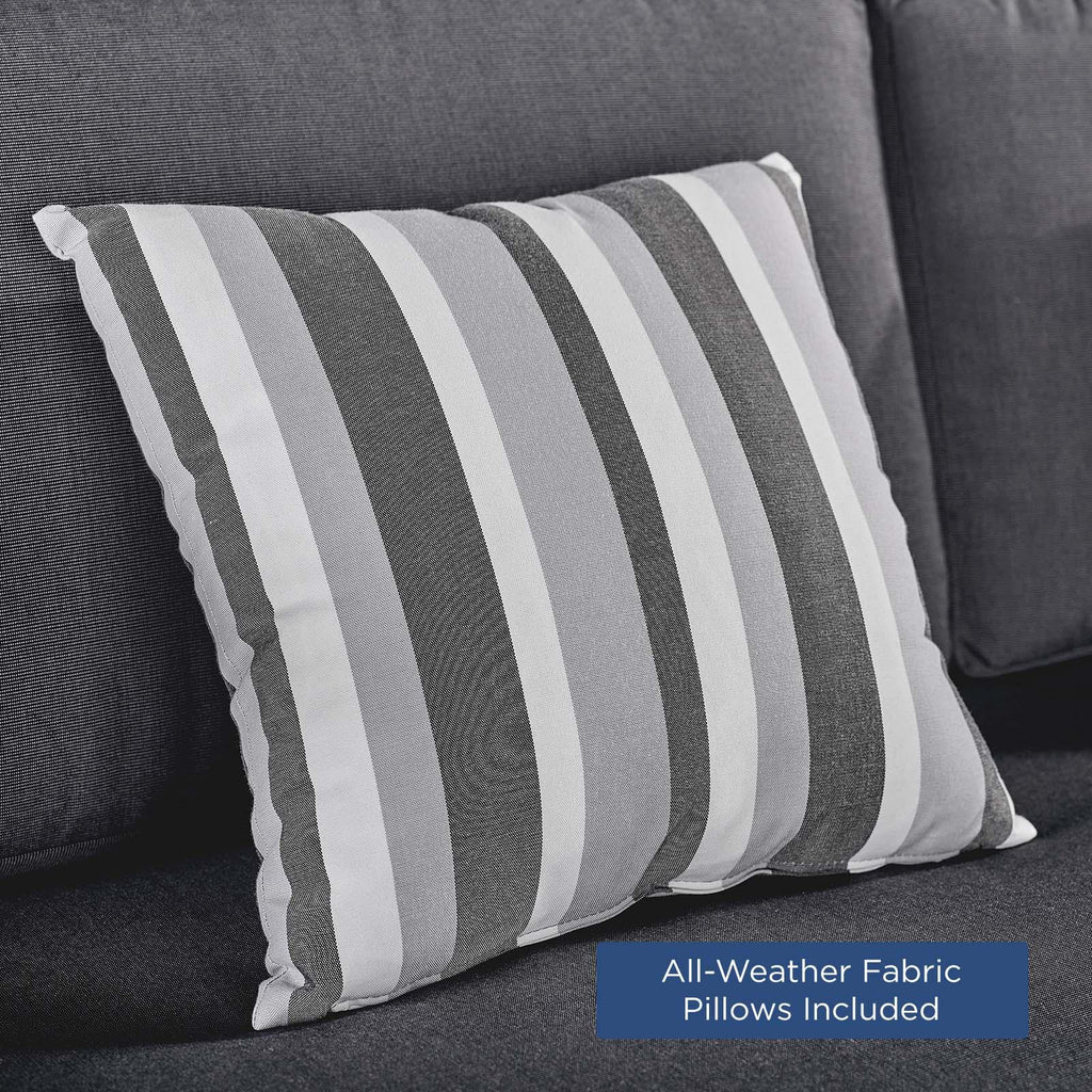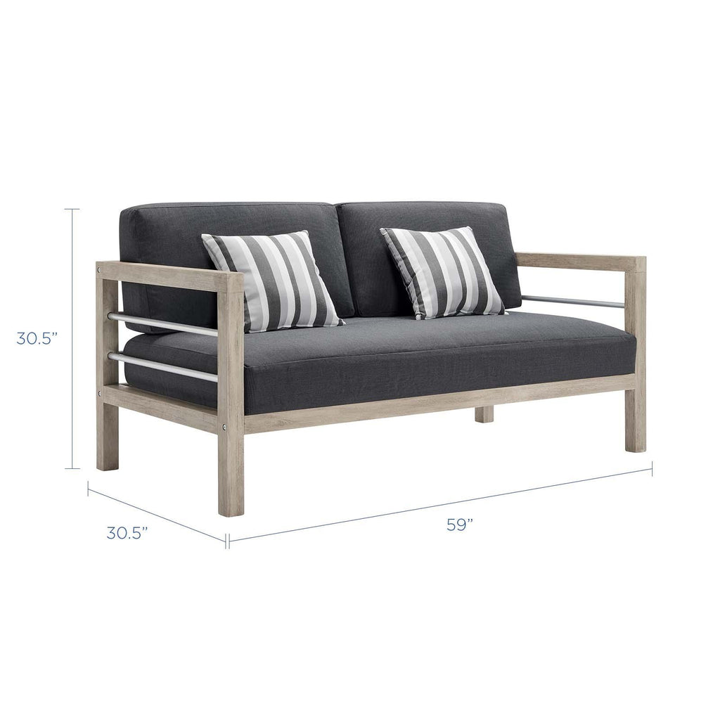 Invoke the refreshing feel of coastal accents with the Wiscasset Outdoor Patio Wood 59" Loveseat. This FSC certified acacia wood two-seater loveseat has a slatted base with a reinforced center beam and matte aluminum supports for a strong seating experience. Densely padded all-weather cushions come with durable machine washable covers. Complete with two coordinating accent throw pillows, this modern outdoor loveseat will effortlessly enhance the decor of your patio, deck, porch, or poolside. Loveseat Weight Capacity: 661 lbs.