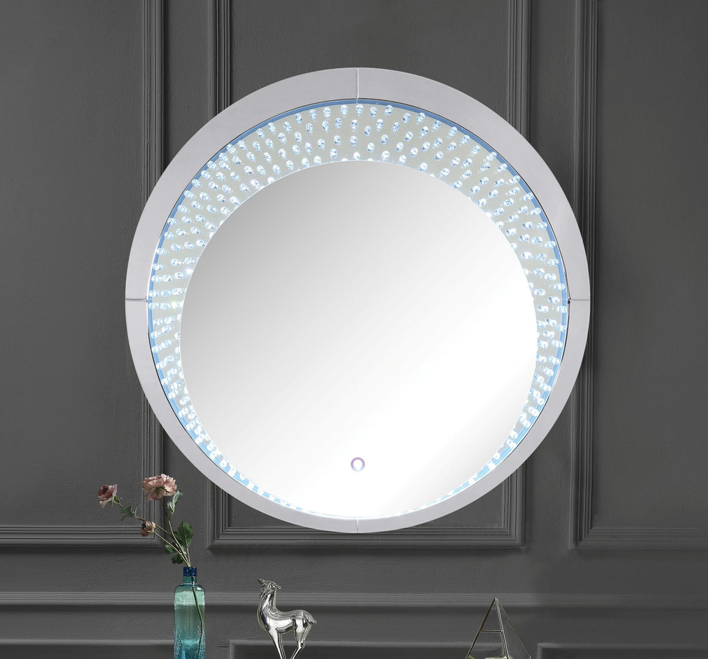 ACME Nysa Wall Decor (LED), Mirrored & Faux Crystals, 39"Dia, 62lbs. Features: - Accent Wall Decor - LED Light Included - Beveled Mirrored Finish - Faux Crystals Inlay & 4mm Clear Tempered Glass Materials: Mirror, LED Light, Glass, Faux Crystals, Composite Wood