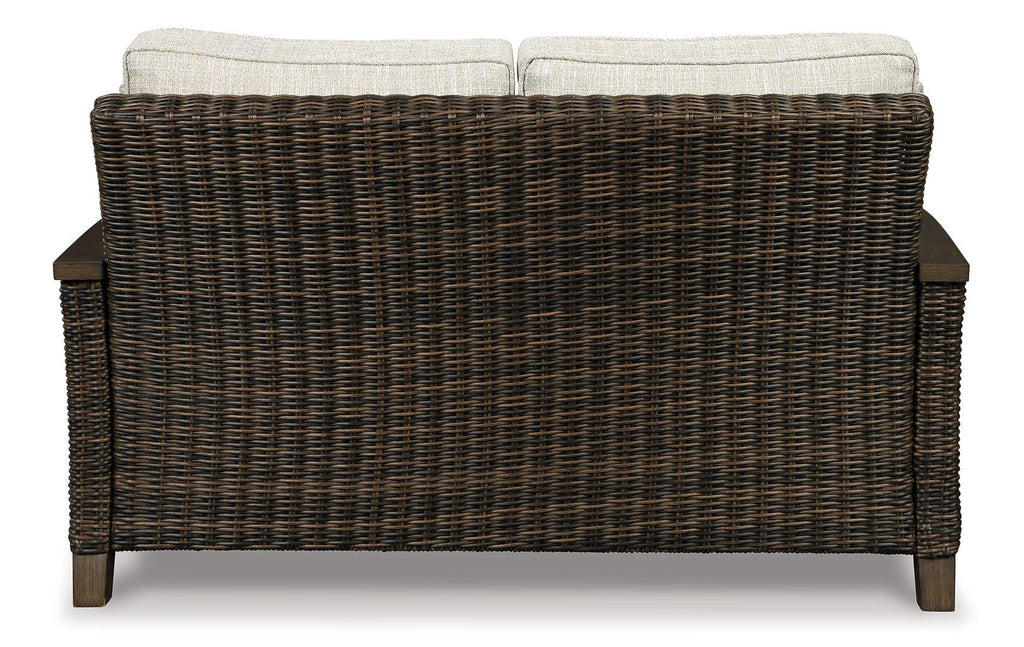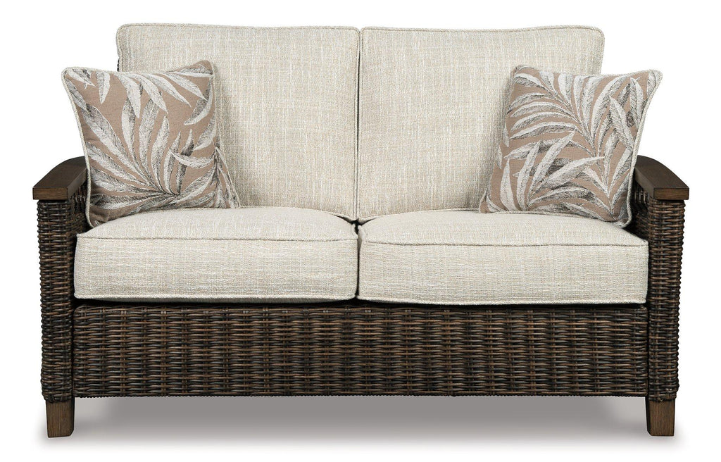 Pretty enough for trendy interiors, yet durable enough to weather the elements, the Paradise Trail outdoor loveseat rises to the challenge beautifully. Handwoven resin wicker over rust-proof aluminum merges high style with low maintenance. Rest assured, though the exposed armrests and feet look remarkably like wood, their sturdy aluminum construction is perfectly suited for alfresco living. Plush seat cushions and throw pillows wrapped in high-performing Nuvella® fabric aim to please.