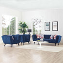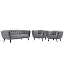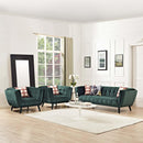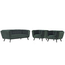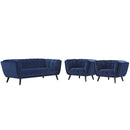 Generously update your d�cor with Bestow Performance Velvet Living Room Set. Uniquely designed with a striking broad profile, Bestow comes in soft, stain-resistant performance velvet polyester upholstery with dense foam padding and elegant button tufting. Sturdily positioned on splayed and tapered black finish wood legs with non-marking foot caps, Bestow boasts a bountiful living room seating design brimming with possibilities. With ample seat depth and overscaled frame, invite all your guests to sit comfortably in this 12" high back and arm rest collection perfect for mid-century, modern farmhouse or contemporary decors.