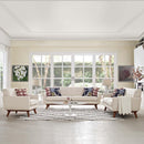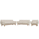 Gently sloping curves and large dual cushions create a favorite lounging spot with Engage Upholstered Fabric Button Tufted Sofa Furniture Series. Whether plopping down after a long day at work, settling in with coffee and brunch, or entering a spirited discussion with friends, the Engage Upholstered Fabric Button Tufted Sofa, Loveseat and Armchair set is a welcome presence in your home. Seven tufted buttons create eye-catching appeal, adding depth that brings your sitting d�cor to center stage. Four cherry color rubberwood legs and frame supply a solid base to the comfortably durable and stain-resistant upholstery.