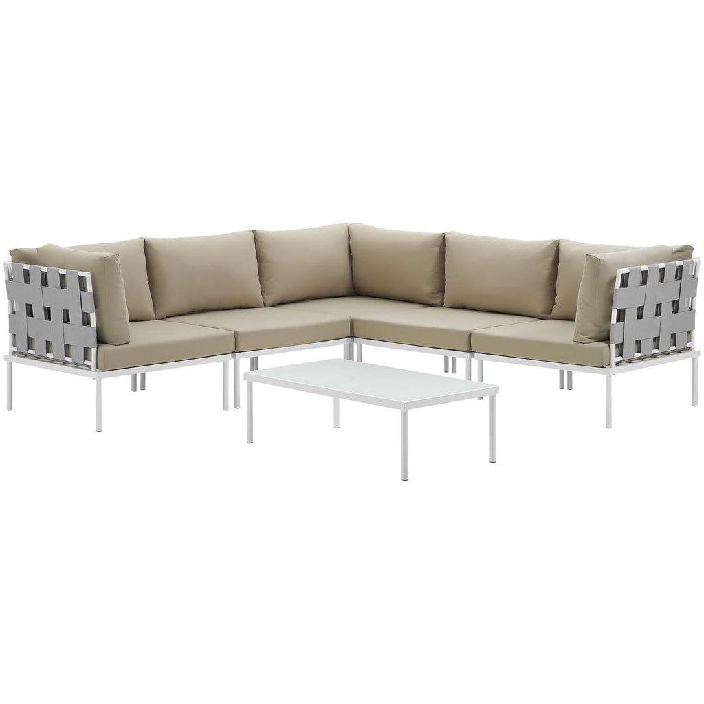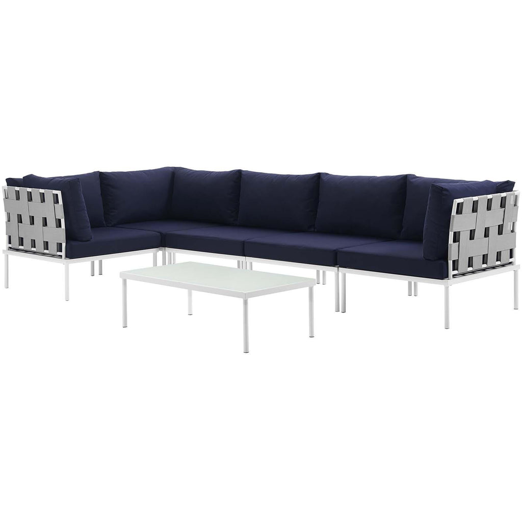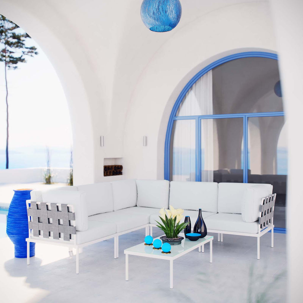 Engage life with Harmony Outdoor Patio Sectional Sofa Furniture Set. Enjoy casual conversation under the open sky with an all-weather waterproof furniture set that delivers an exceptional outdoor porch, patio, balcony or garden experience. An exceptional modern patio furniture set that exceeds expectations, this Harmony Outdoor Sectional set comes with long-lasting machine washable cushions, silk polyester seat back weave, square powder coated aluminum bases, tempered glass top tables, and non-marking foot caps. A sectional sofa that arranges according to the spontaneous needs of your guests, set your sights on open and inspired moments with the Harmony Outdoor Patio Collection.