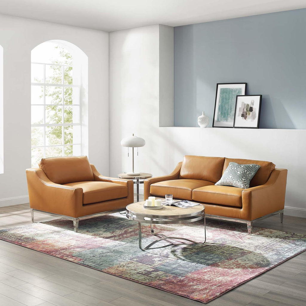 Center your space with the Harness Loveseat & Armchair Set. Featuring soft leather upholstery, Harness comes with dense foam padded seat cushions, supportive cotton-filled back pillows, a sinuous spring support system, and a polished stainless steel frame with non-marking foot caps. Perfect for the living room, meeting room or recreation area, this set fuses modern intrigue with timeless appeal for a sleek low-profile couch that completes the look of any vintage or contemporary modern home or apartment. Cushions remove for easy cleaning.