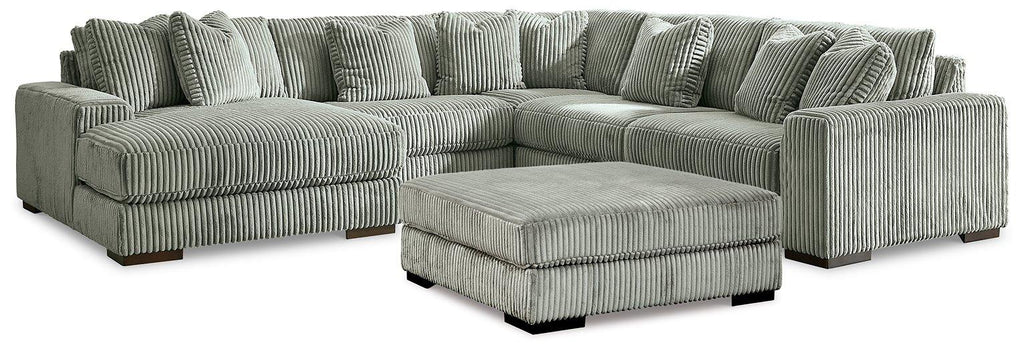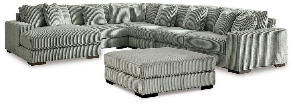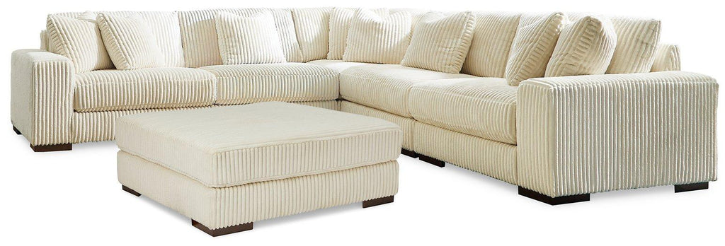 Plush and posh. Showcase your eye for on-trend texture with the statement-making cord upholstery of this sectional and ottoman package. Its stunningly soft fabric entices in a light gray hue, complementing contemporary color palettes. Sink into the cushions and plan to stay a while—this cozy living room seating set highlights your high-end approach to comfort and style.