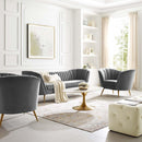 Introduce vintage glamour with the Opportunity Performance Velvet Sofa and 2 Armchair Set. Featuring a scalloped silhouette and elegantly curved back, Opportunity delivers a luxurious seating experience with soft, stain-resistant performance velvet upholstery, an individually wrapped pocket coil system, and dense foam padding. Complete with a removable seat cushion with a removable cover, Opportunity features interior vertical channel tufting along the interior with this comfortable retro-modern set for your living room or lounge room.