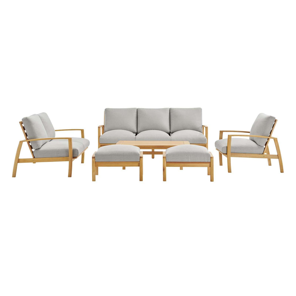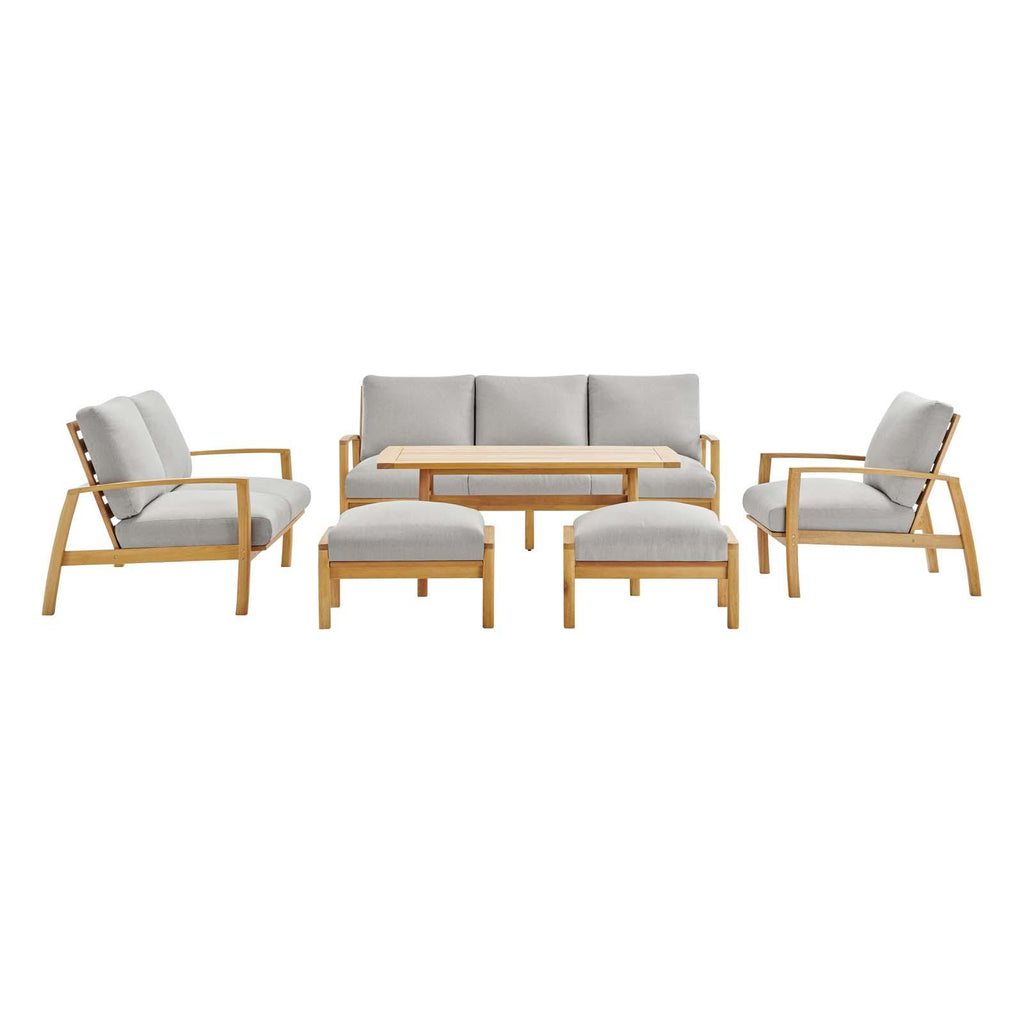 A versatile update to your patio decor, this Orlean Outdoor Patio Set features a stylish 57" dining table designed to enhance any outdoor furniture assortment. This set also includes a sofa, loveseat, armchair, and two ottomans. Made of FSC certified eucalyptus wood, Orlean features slatted table top surface and slatted seating surface. Enjoy the generously padded all-weather cushions at any event. This outdoor dining set is a welcome addition to the backyard, deck, or patio.