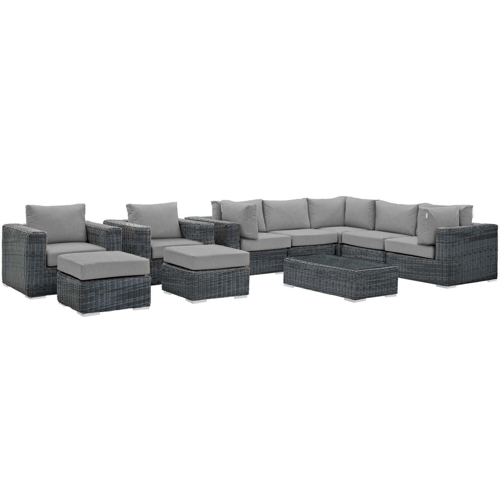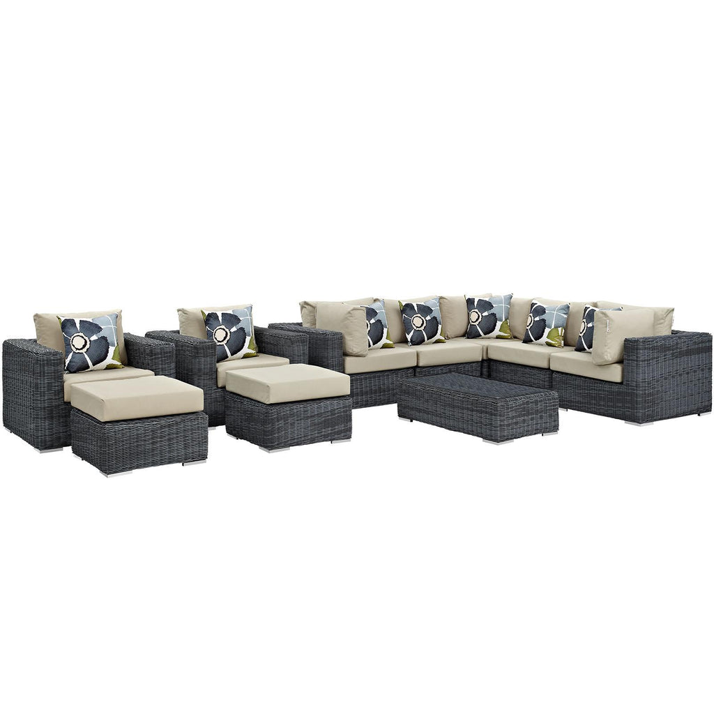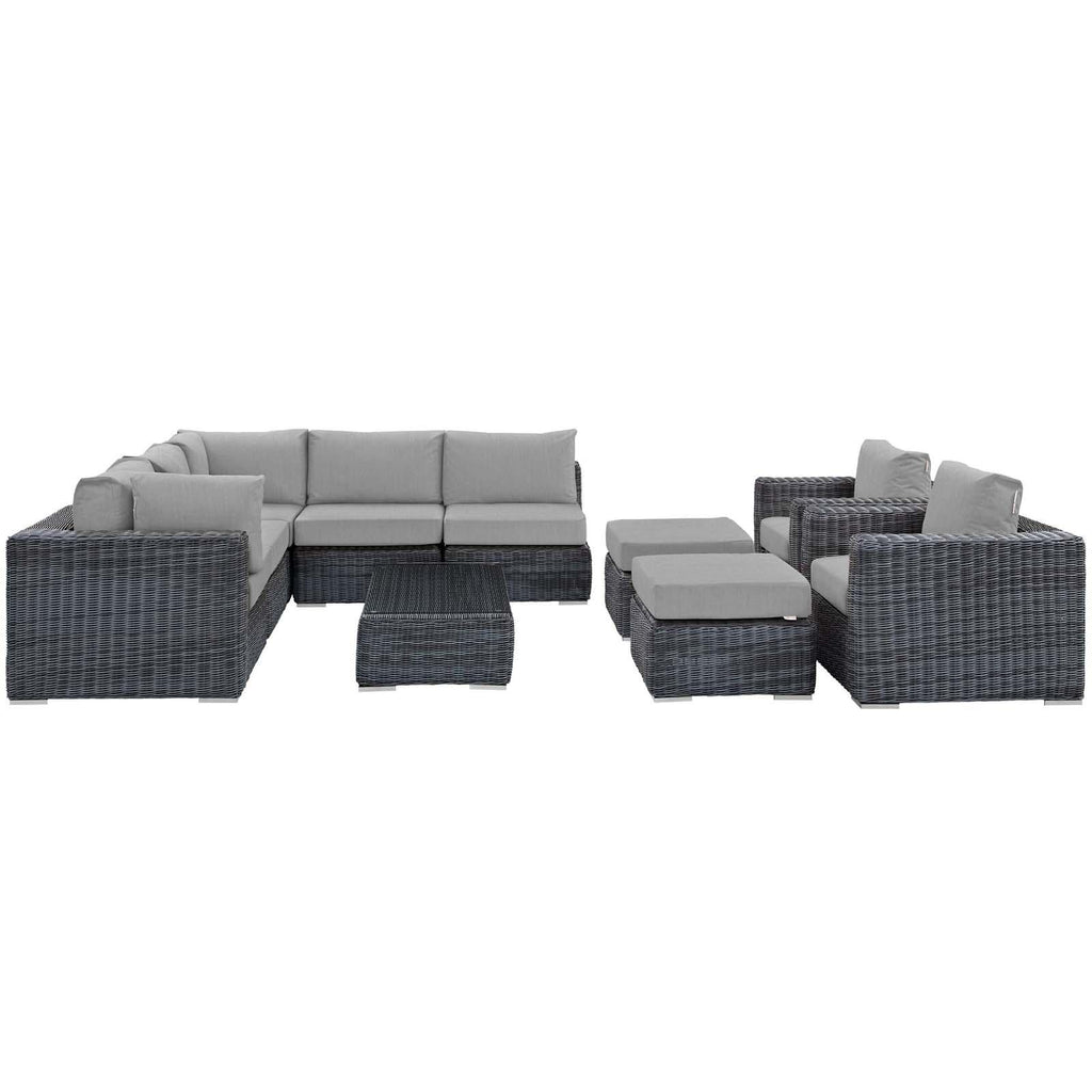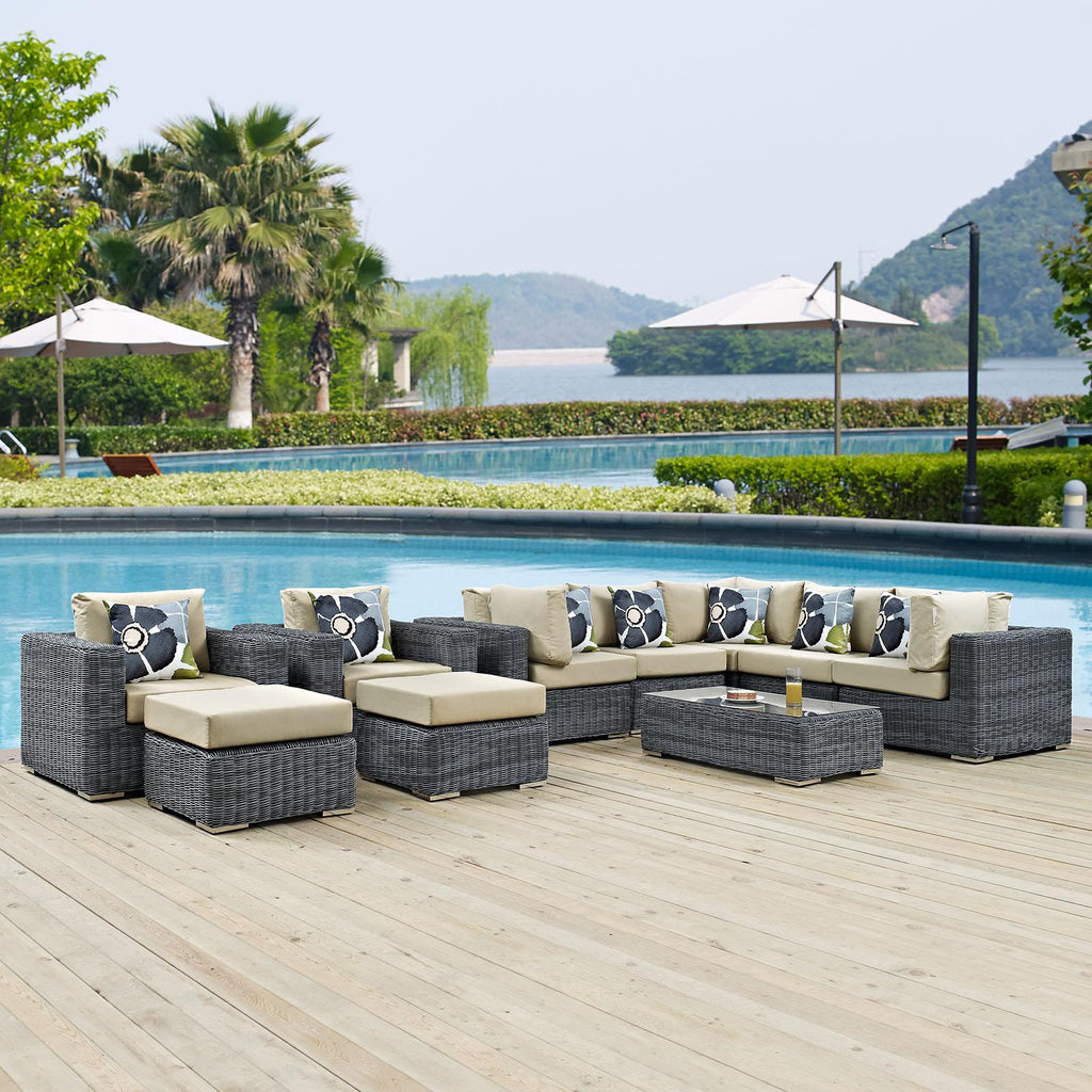 Experience the outdoors with exceptional comfort and quality. Summon Outdoor Patio Sectional Sofa set offers an exquisite two-tone synthetic rattan weave, plush all-weather cushions with industry-leading Sunbrella� fabric, UV protection, and a sturdy powder-coated aluminum frame. Featuring an elegant modern look, Summon Patio Sectional Sofa Set is part of an avant-garde outdoor sectional series well-equipped for enhancing patio, backyard, or poolside gatherings. This installment of the series is an Outdoor Patio Furniture set with Coffee Table.