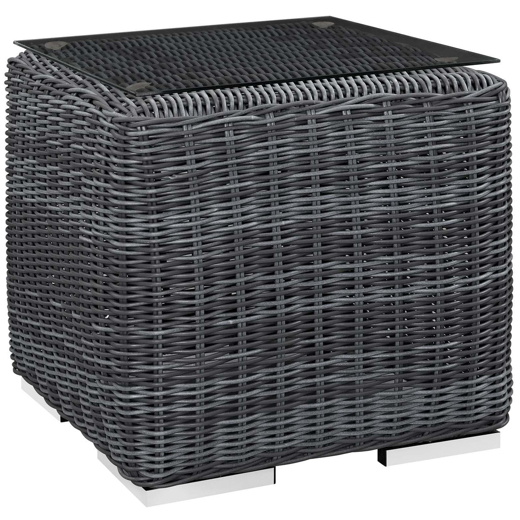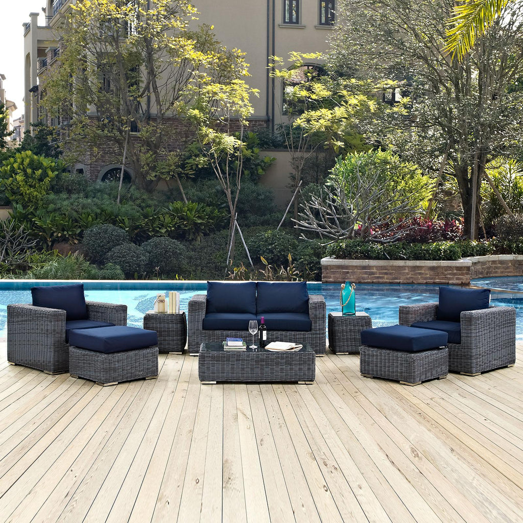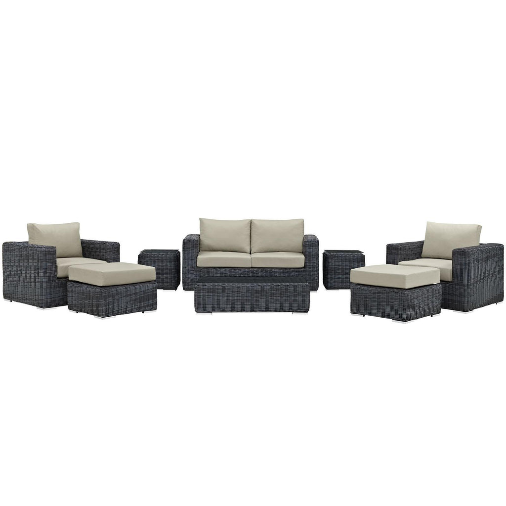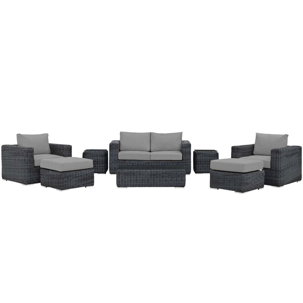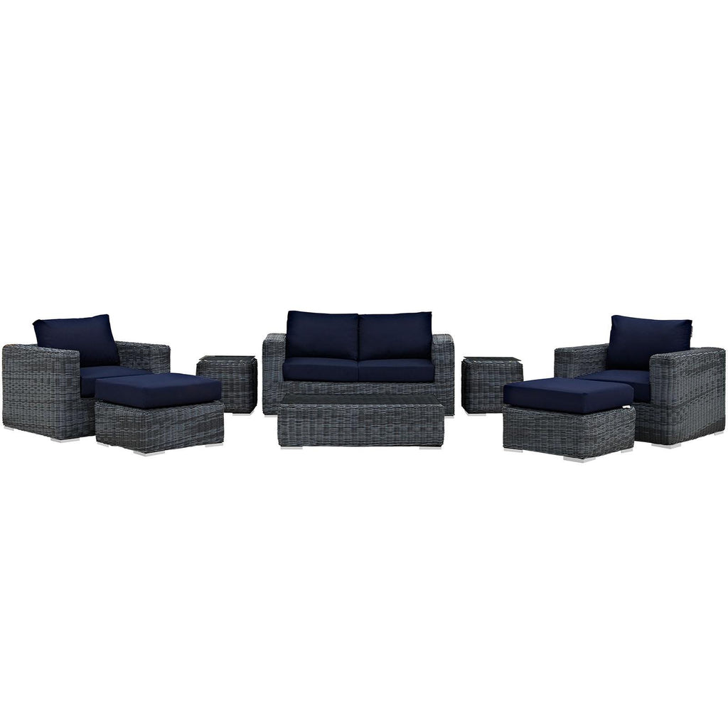Experience the outdoors with exceptional comfort and quality. Summon Outdoor Patio Sectional Sofa set offers an exquisite two-tone synthetic rattan weave, plush all-weather cushions with industry-leading Sunbrella� fabric, UV protection, and a sturdy powder-coated aluminum frame. Featuring an elegant modern look, Summon Patio Sectional Sofa Set is part of an avant-garde outdoor sectional series well-equipped for enhancing patio, backyard, or poolside gatherings. This installment of the series is an Outdoor Patio Furniture set with Coffee Table. Set Includes: One - Summon Rattan Outdoor Patio Coffee Table One - Summon Rattan Outdoor Patio Loveseat Two - Summon Rattan Outdoor Patio Armchairs Two - Summon Rattan Outdoor Patio Ottomans Two - Summon Rattan Outdoor Patio Side Tables Long Lasting Sunbrella� Fabric Round Synthetic Rattan Weave Powder Coated Aluminum Frame Water & UV Resistant Plush Machine Washable Cushions Ships Pre-Assembled Overall Product Dimensions: 57.5"L x 165"W x 25"H Overall Armchair Dimensions: 35"L x 35"W x 25"H Overall Loveseat Dimensions: 63"L x 35"W x 25"H Overall Coffee Table Dimensions: 23.5"L x 43.5"W x 12"H Overall Side Table Dimensions: 17.5"L x 17.5"W x 17.5"H Overall Ottoman Dimensions: 21.5"L x 26"W x 12"H