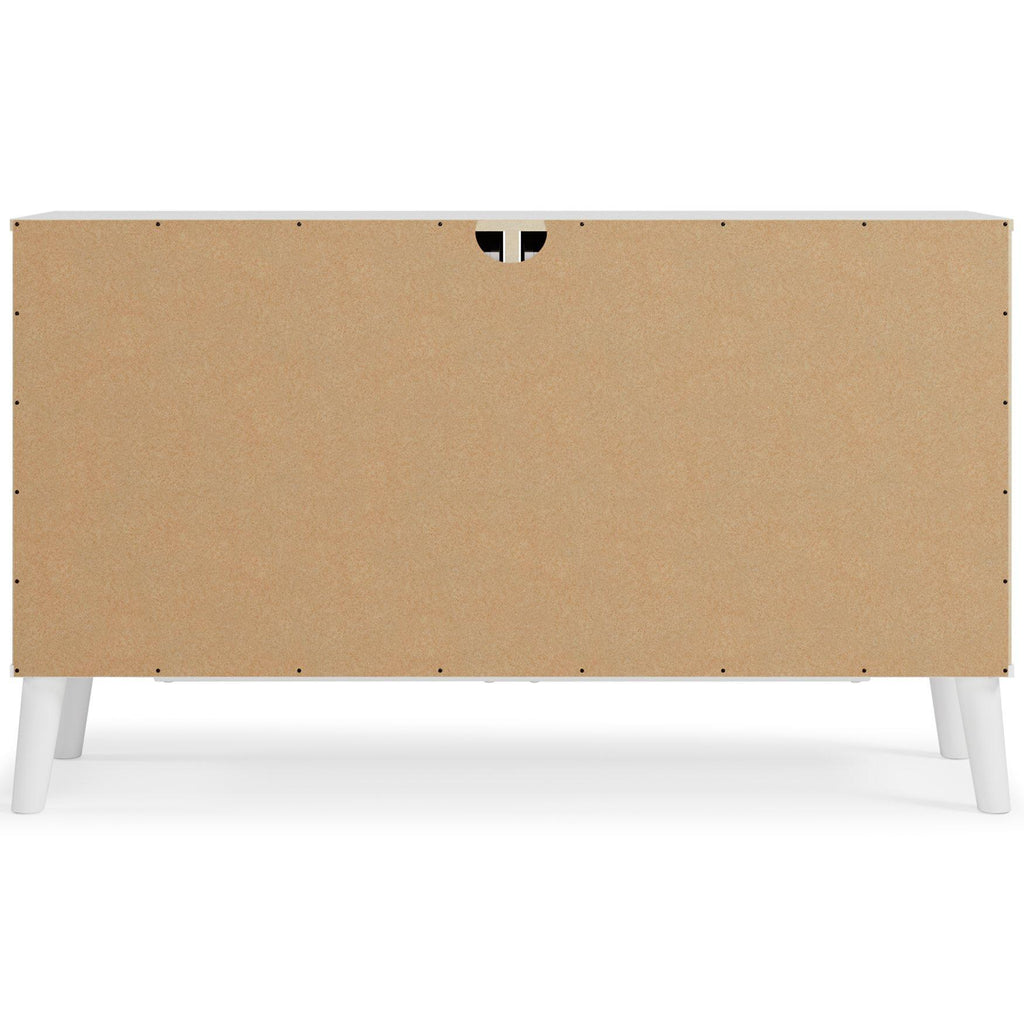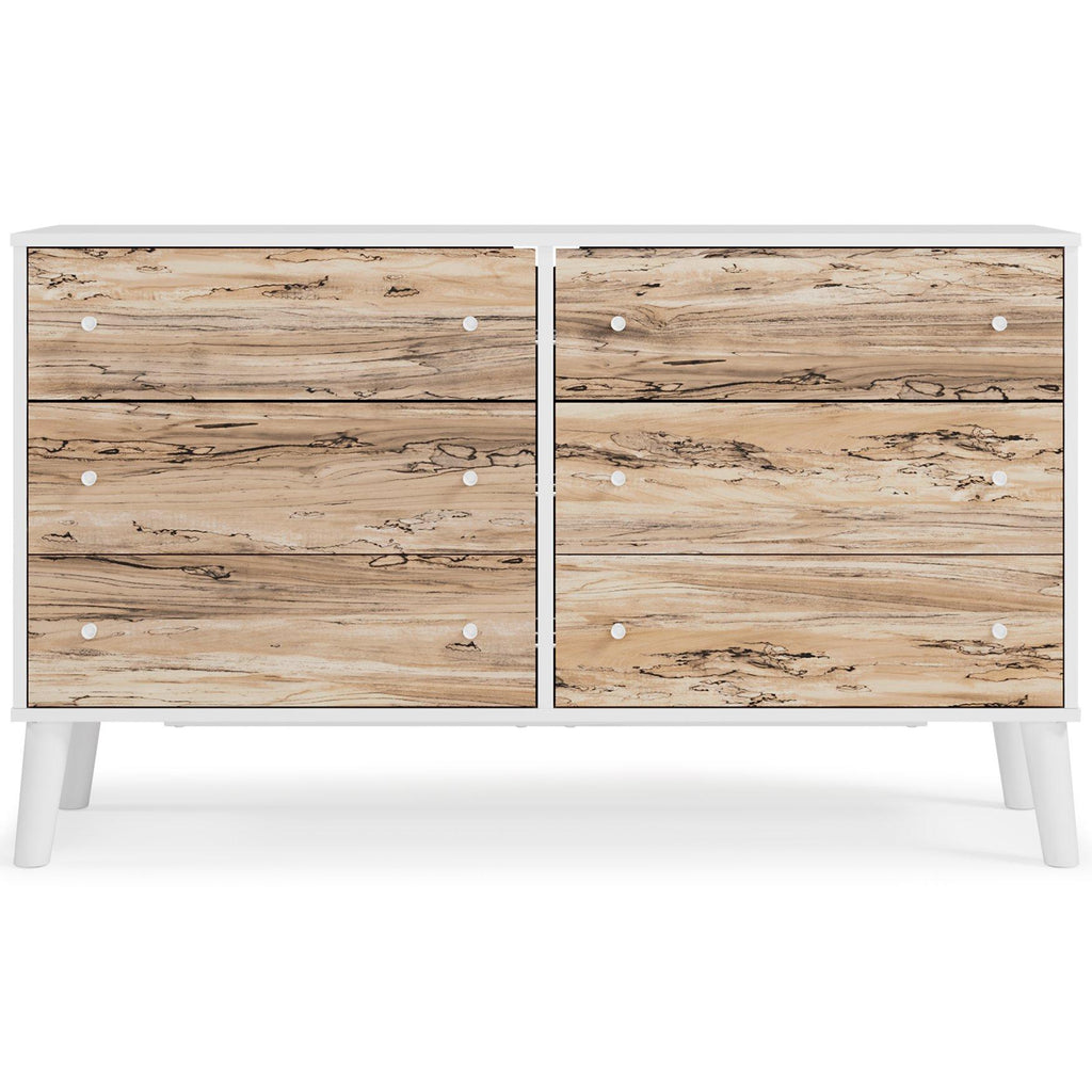 The perfect marriage of simple and contemporary style, this dresser is a charming addition to your home. It features an expressive two-tone look, with a dark charcoal finish over replicated oak grain with an authentic touch and a replicated sugarberry wood grain. Ball-bearing glides offer smooth opening and closing of the drawers, while matte black knobs and splay legs add a finishing touch.