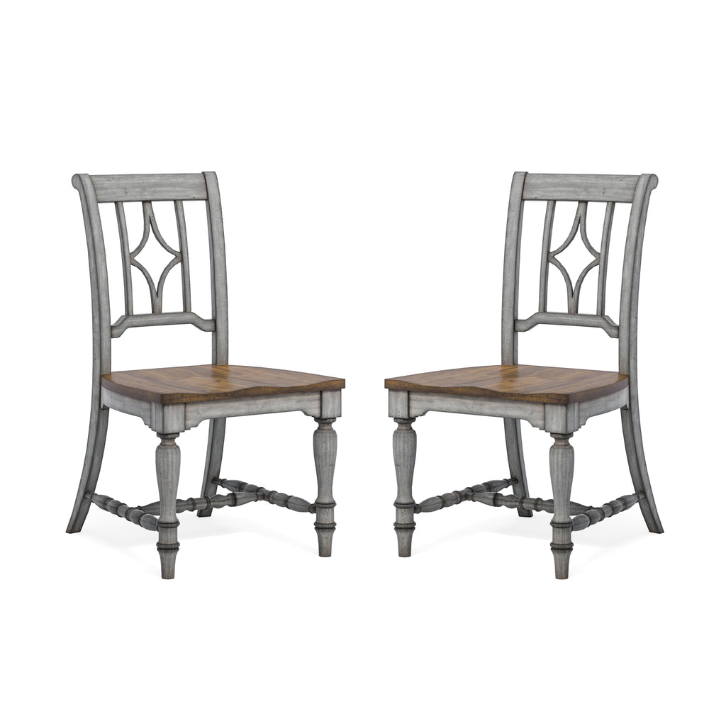 Add cozy charm to mealtimes with the Plymouth dining chair, designed to complement our Plymouth dining tables with a coordinating cottage look. Featuring an appealing open back design with a diamond-shaped detail, intricately carved trestles and turned legs, this chair provides a vintage look thatÕs full of character. With its weathered graywash finish and contrasting medium brown seat, this chair can be easily mixed and matched with other Plymouth chairs in the collection for a cohesive look.