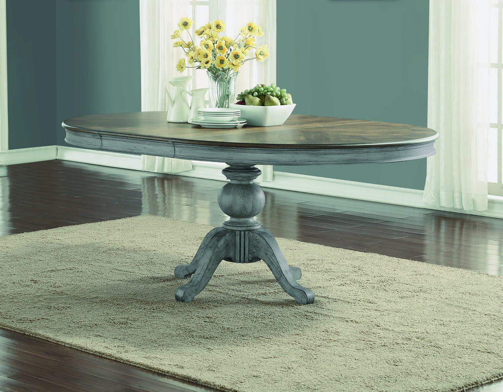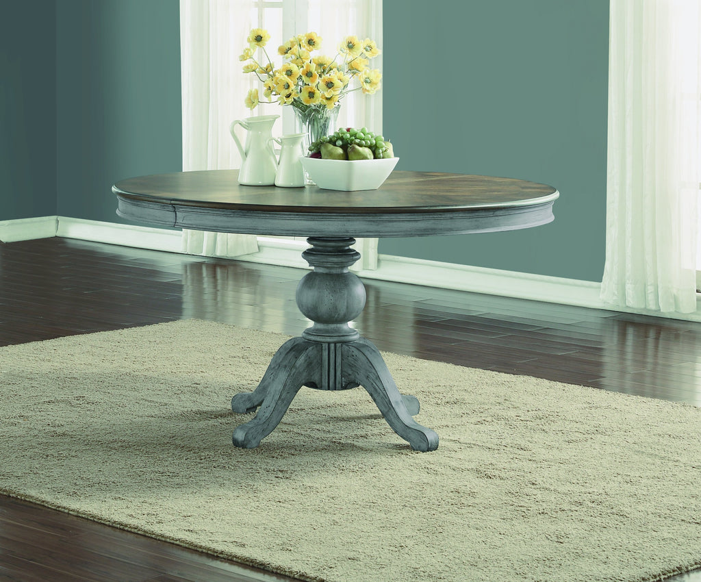 Effortlessly transition from small family meals to entertaining additional dining guests with the versatile Plymouth round dining table. This classic design easily fits in smaller dining areas to comfortably seat four and can expand to accommodate more by adding the included leaf. Featuring an intricately carved single pedestal base and a distressed graywash finish accented by a medium brown top, this table evokes a cottage-style charm that adds warmth and character to your home.