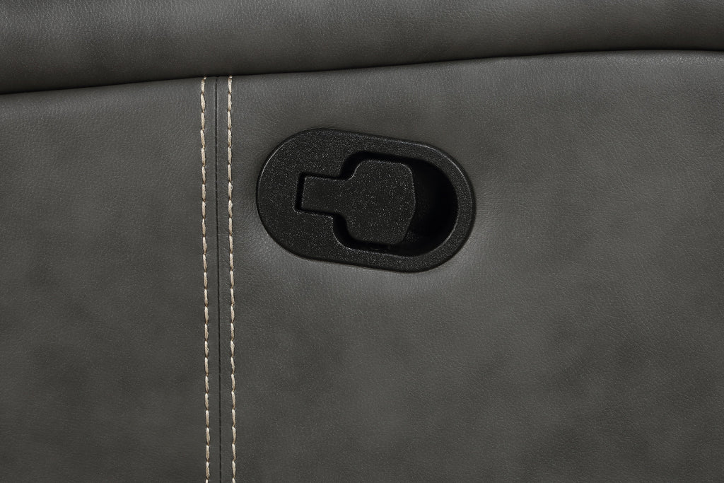 Settle into comfort with this transitional recliner, blending modern lines with timeless appeal. Upholstered in smooth grey leatherette, it features vertical topstitching that adds depth and dimension. Plush foam padding and pocket coil seating provide supportive comfort, while an attached back cushion and ultra-padded headrest create the perfect spot for relaxation. A manual reclining mechanism offers multiple positions, and a wall-hugger design maximizes space efficiency, making this chair a smart choice for any living room._x005F_x000D_ Key Features: • Recliner upholstered in smooth grey leatherette with vertical topstitch accents • Manual reclining function provides adjustable comfort for relaxation at home • Wall-hugger design maximizes floor space in compact or larger living areas • Plush foam padding and pocket coil seating ensure durable supportive comfort • Attached back cushion with ultra-padded headrest enhances lounging experience • Durable plywood and metal frame construction offers stability and longevity