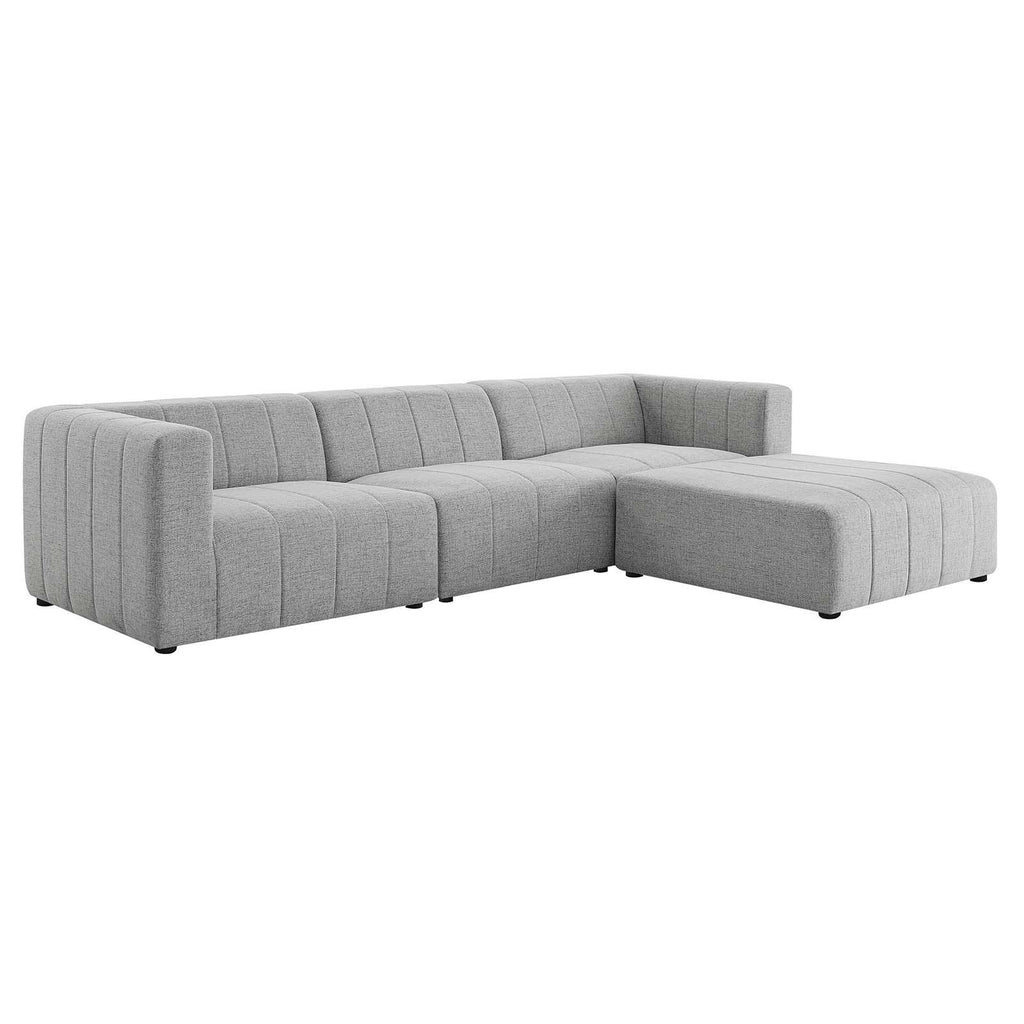 Indulge in comfort and relaxation by creating a custom living room and lounge area with the Bartlett Upholstered Fabric 4-Piece Sectional Sofa. Featuring subtle channel tufting, rounded corners, and soft polyester fabric upholstery, this sectional sofa brings retro modern style and contemporary allure to your living space. Dense foam padding and a pocket coil spring system in the cushions offer a luxe seating experience with premium support and comfort. With a sturdy frame crafted from solid wood and plywood, this living room sofa features modular connectors to keep each sectional sofa piece secure and non-marking foot caps to protect flooring. Weight Capacity for Each Piece: 331 lbs. Set Includes: One - Bartlett Armless Chair One - Bartlett Left-Arm Chair One - Bartlett Ottoman One - Bartlett Right-Arm Chair 4-Piece Sectional Sofa Soft Polyester Fabric Upholstery Dense Foam Padding Pocket Coil Spring System Non-Marking Foot Caps Modular Connectors Weight Capacity for Each Piece: 331 lbs. Overall Right-Arm Chair Dimensions: 42"L x 43.5"W x 27.5"H Seat Dimensions: 28"L x 35"W x 17"H Backrest Dimensions: 8.5"L x 35"W x 10.5"H Armrest Dimensions: 33.5"L x 8.5"W x 10.5"H Overall Left-Arm Chair Dimensions: 42"L x 43.5"W x 27.5"H Seat Dimensions: 33.5"L x 35"W x 17"H Backrest Dimensions: 35"L x 8.5"W x 10.5"H Overall Armless Chair Dimensions: 42"L x 35.5"W x 27.5"H Seat Dimensions: 28"L x 35.5"W x 17"H Backrest Dimensions: 28"L x 14"W x 10"H Overall Ottoman Dimensions: 43.5"L x 42"W x 17"H Seat Dimensions: 43.5"L x 42"W x 17"H Overall Product Dimensions: 85.5"L x 129"W x 27.5"H