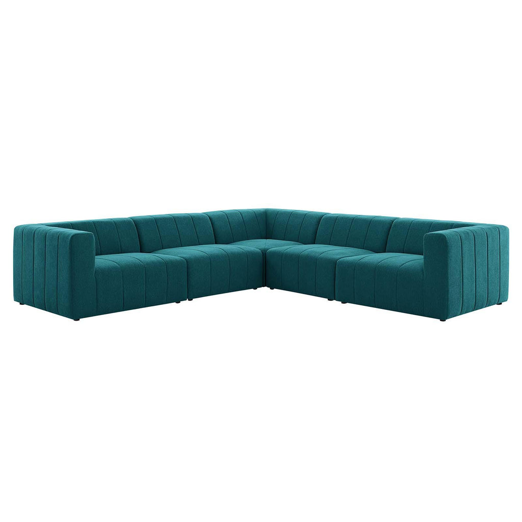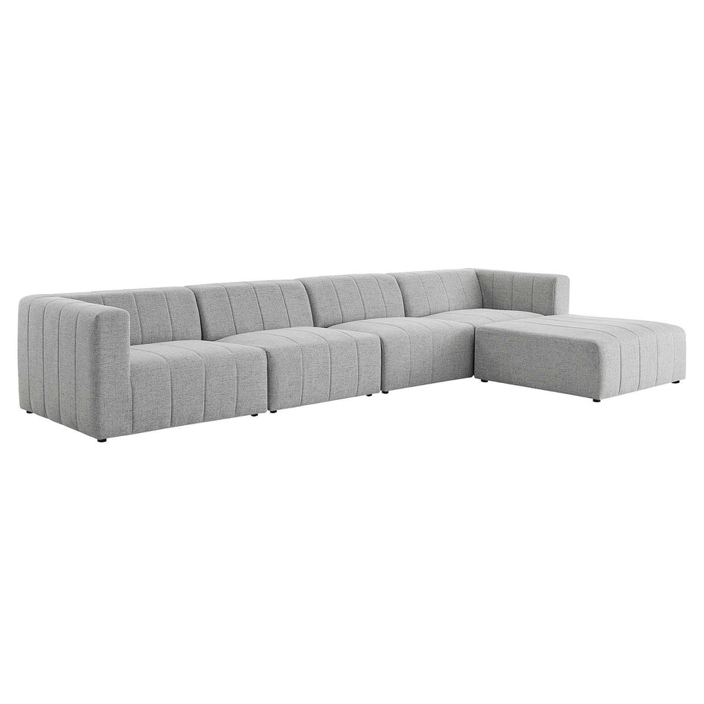 Indulge in comfort and relaxation by creating a custom living room and lounge area with the Bartlett Upholstered Fabric 5-Piece Sectional Sofa. Featuring subtle channel tufting, rounded corners, and soft polyester fabric upholstery, this sectional sofa brings retro modern style and contemporary allure to your living space. Dense foam padding and a pocket coil spring system in the cushions offer a luxe seating experience with premium support and comfort. With a sturdy frame crafted from solid wood and plywood, this living room sofa features modular connectors to keep each sectional sofa piece secure and non-marking foot caps to protect flooring. Weight Capacity for Each Piece: 331 lbs. Set Includes: One - Bartlett Left-Arm Chair One - Bartlett Ottoman One - Bartlett Right-Arm Chair Two - Bartlett Armless Chair 5-Piece Sectional Sofa Soft Polyester Fabric Upholstery Dense Foam Padding Pocket Coil Spring System Non-Marking Foot Caps Modular Connectors Weight Capacity for Each Piece: 331 lbs. Overall Right-Arm Chair Dimensions: 42"L x 43.5"W x 27.5"H Seat Dimensions: 28"L x 35"W x 17"H Backrest Dimensions: 8.5"L x 35"W x 10.5"H Armrest Dimensions: 33.5"L x 8.5"W x 10.5"H Overall Left-Arm Chair Dimensions: 42"L x 43.5"W x 27.5"H Seat Dimensions: 33.5"L x 35"W x 17"H Backrest Dimensions: 35"L x 8.5"W x 10.5"H Overall Armless Chair Dimensions: 42"L x 35.5"W x 27.5"H Seat Dimensions: 28"L x 35.5"W x 17"H Backrest Dimensions: 28"L x 14"W x 10"H Overall Ottoman Dimensions: 43.5"L x 42"W x 17"H Seat Dimensions: 43.5"L x 42"W x 17"H Overall Product Dimensions: 85.5"L x 171"W x 27.5"H