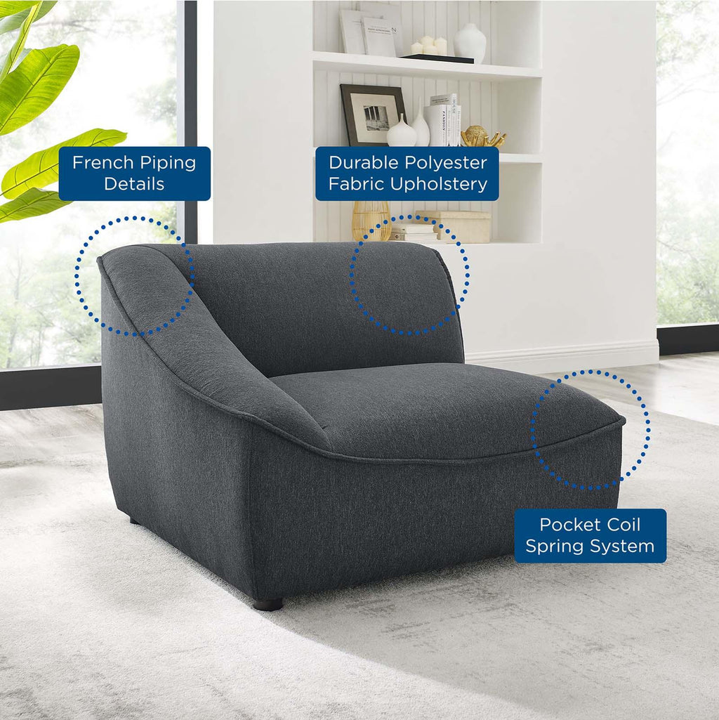Indulge in cozy relaxation in the comfort of your own home with the Comprise Upholstered Left-Arm Sectional Sofa Chair. A casual design accented with French piping details, this sectional sofa piece features dense foam padding, soft polyester upholstery and a pocket coil spring system to offer a premium seating experience. Solidly constructed with solid wood and plywood, this upholstered sectional sofa collection rests atop sturdy rubberwood legs with secure connectors between modular pieces. Create a custom living room or lounge area with the Comprise Living Room Furniture Collection. Chair Weight Capacity: 400 lbs.